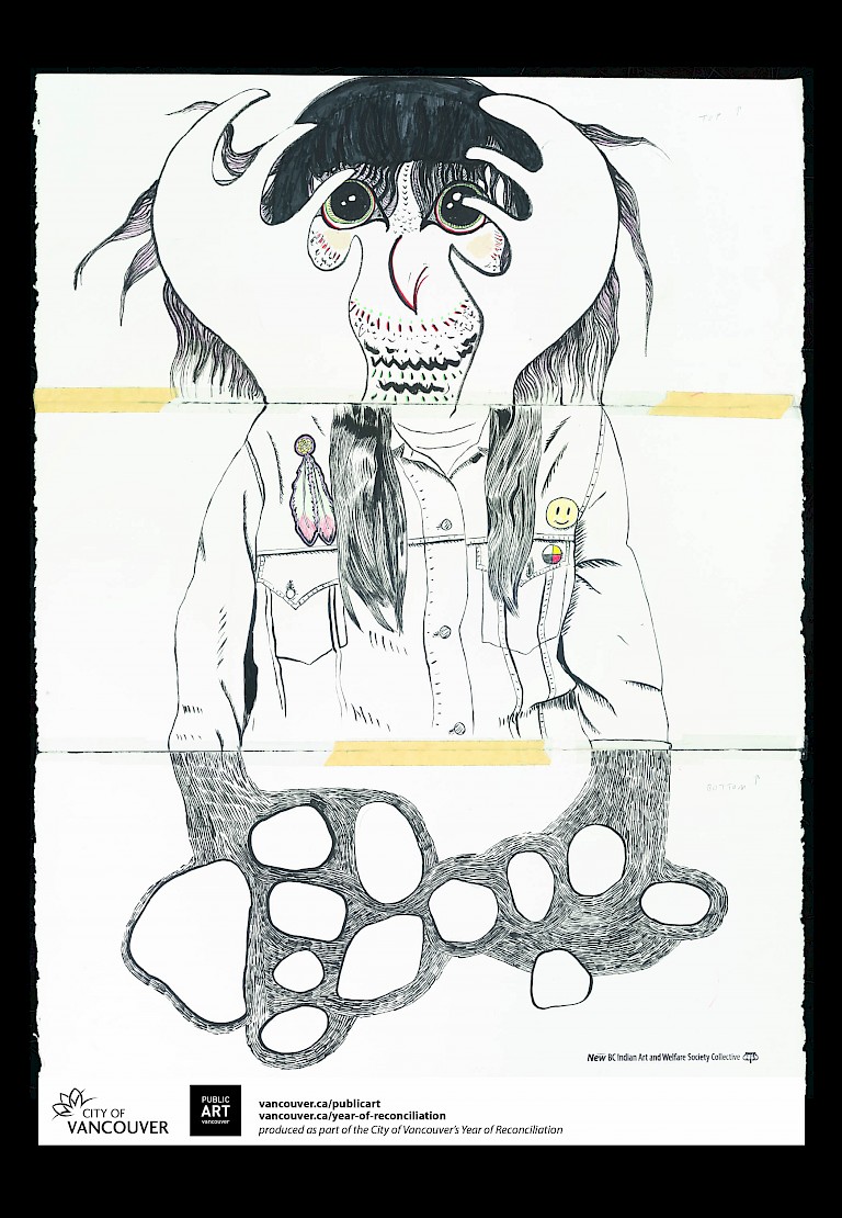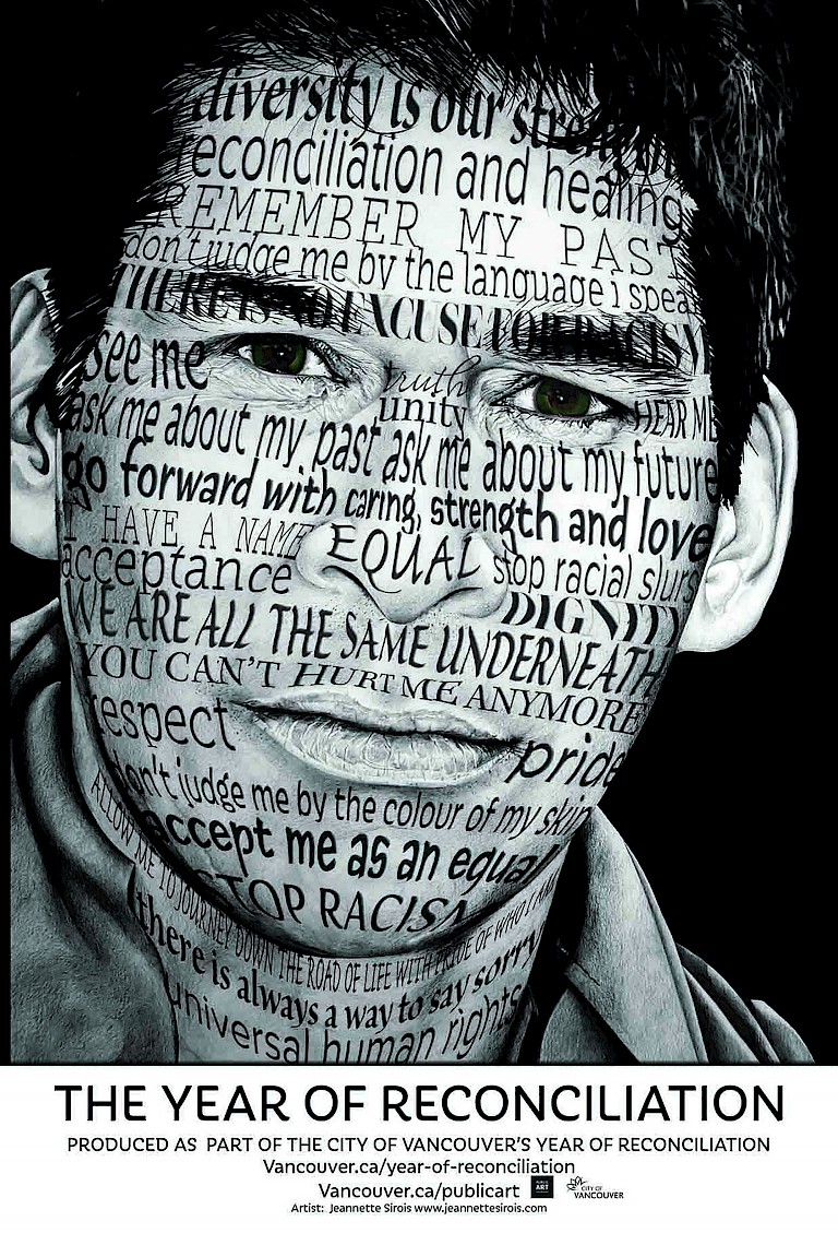 The Year of Reconciliation public art series devoted existing resources, including transit shelters, downtown video screens, and the Vancouver Public Library, towards enhancing the Reconciliation initiative with an eight-month public exhibition of changing works. For the program, artists from across Canada were invited to propose 2-dimensional artworks related to reconciliation for temporary installation.