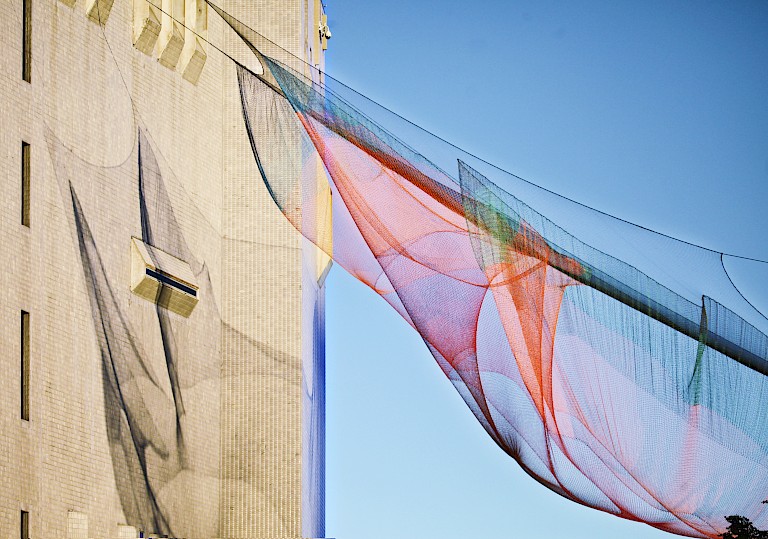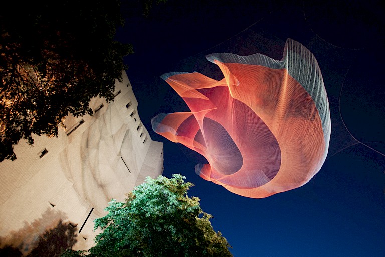 Suspended from the roof of the seven-story Denver Art Museum above downtown street traffic, the undulating forms of 1.26 Denver brought softness into a hard-edged urban landscape. Engineered to imitate the intricacy of handmade lace, the billowing shape, animated by the wind, evoked awe, introducing the possibility of reverence into the daily bustle of city life. At night, darkness concealed the support cables while colored lighting illuminated a floating luminous form.