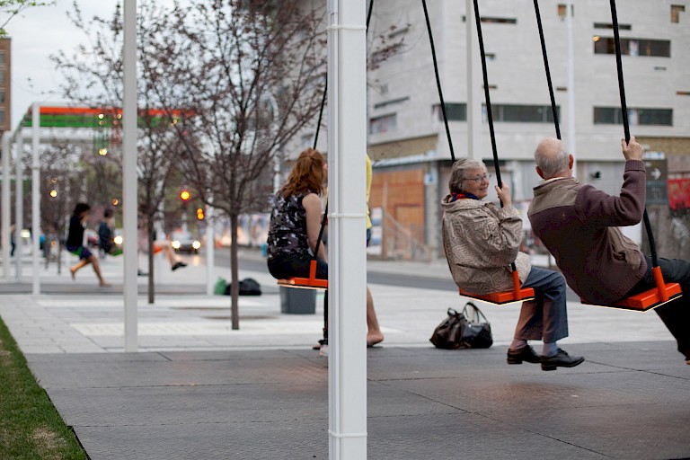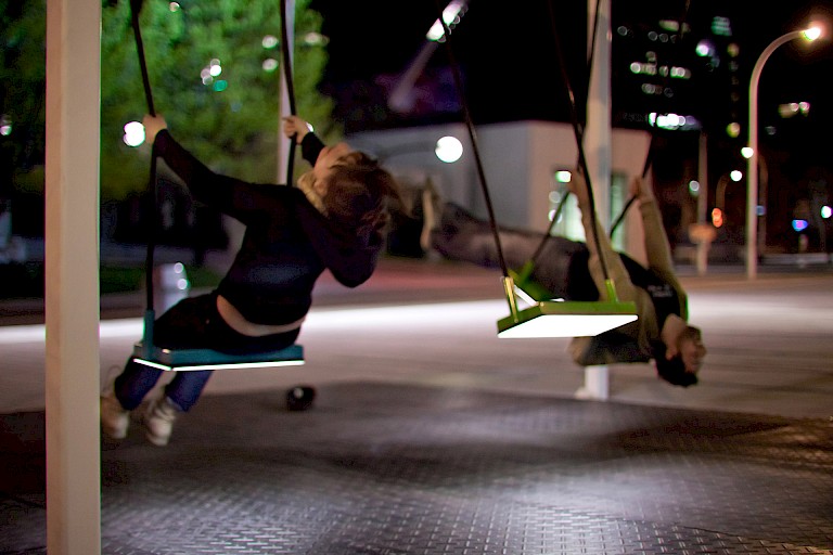 Playfulness is embedded in all of Daily’s public art projects. Originally the team explored using seesaws as the interactive component, but, following a site visit, they decided to use the kiosk frames as the starting point so as to not compete with existing site components. The resulting design is an extended set of 21 interactive swings, each playing a unique note as the user moves back and forth. The swings mount onto the kiosk frames and are installed for eight weeks each spring, serving as a spectacular launch for the spring and summer season of outdoor activities in the quarter.