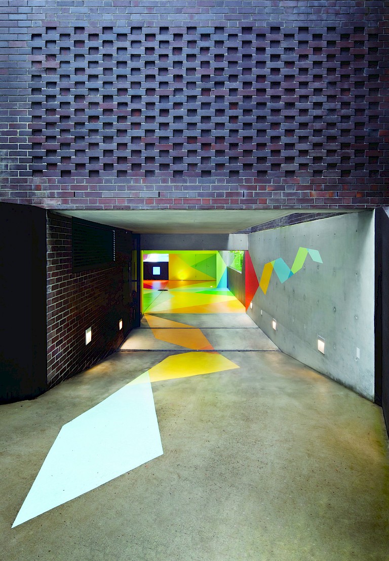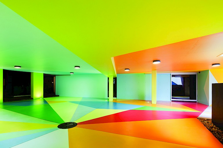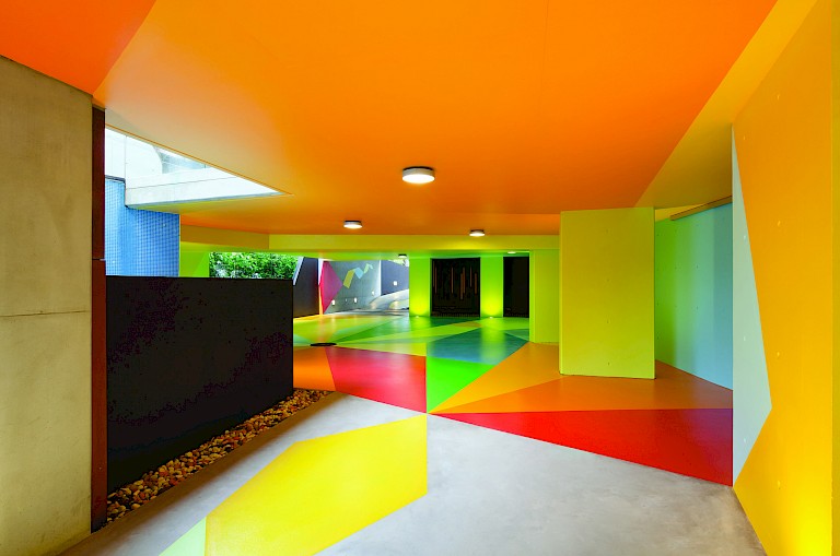 Inside the subterranean car park a spectrum of colors radiate from a metal drainage cover while splices of green, red, and yellow breathe new life into a space, which, with little inlet of natural light, previously felt dark and heavy. The whole piece is tied together by a winding, ribbon-style device which, acting as a central axis, leads in from the driveway, through the space and out to the garden beyond. The resulting design is a dynamic and surreal mix of overlapping geometric forms more like an exploration of tropical Orphic Cubism than standard car parking facility. Intentionally creating an open-ended artwork, Redman and Maier have left some walls blank—albeit awash with color—with the intention that these spaces could potentially be used for additional, individually commissioned works in the future.