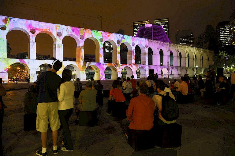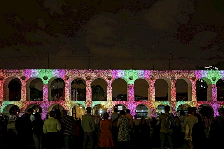 The 2012 version of 77 Million Paintings was installed at Lapa Arches for a short duration—October 19-21, 2012. The Lapa Arches are part of the Carioca Aqueduct, an eighteenth-century relic that runs through the middle of the city and now serves as a bridge for the only remaining active tram line. The area surrounding the Arches could be considered old and run-down, but it is also culturally rich, with a lively live music and nightclub scene. It is a bustling place, with plenty of sound and traffic.