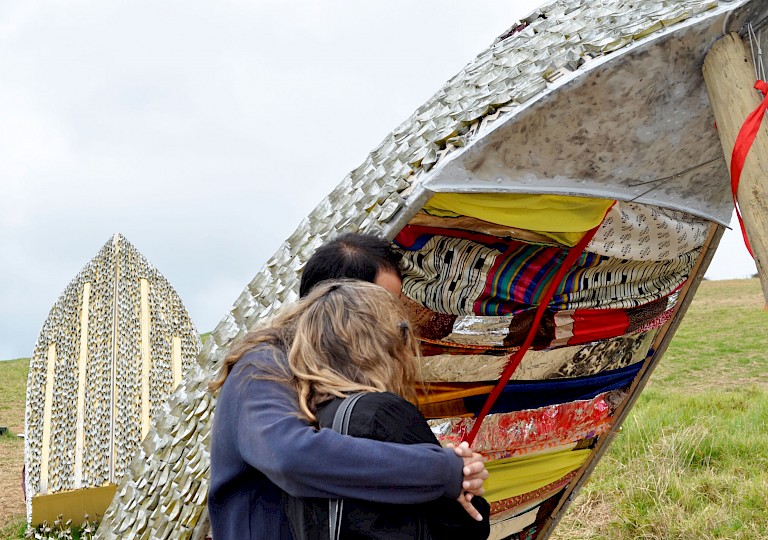 A Journey of a Million Miles Begins with One Step – The Stories of Beyond Refuge took the form of four upright, up-cycled dinghies into which the artist had installed a screen of emergency blankets, and brightly coloured saris. From inside the boats came a soundtrack, individual histories from a book titled Beyond Refuge: stories of resettlement in Auckland that collected the unique stories of New Zealand’s resettled community in their own voices. Audiences were encouraged to stop and listen to the histories on the mats and cushions supplied by the artist, the shade of the boats offering a respite from the hot summer sun. The hull of each of the four boats was decorated with hundreds of small gold Washi paper boats, each individually adhered to the surface.