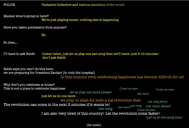 Interventions such as this one may be fleeting in duration, but their lasting impact can be profound. In the case of Karachi, where peaceable assemblies, even to share laughter or music, are prohibited, simply orchestrating such a gathering carries a risk. The Tentative Collective briefly shifted the power dynamics in favor of the displaced migrant workers of Pakhtun, who face the cultural dislocation and political disenfranchisement common among economic refugees. By enacting such a shift, however briefly, the collective opens the possibility of a deeper and more permanent shift.