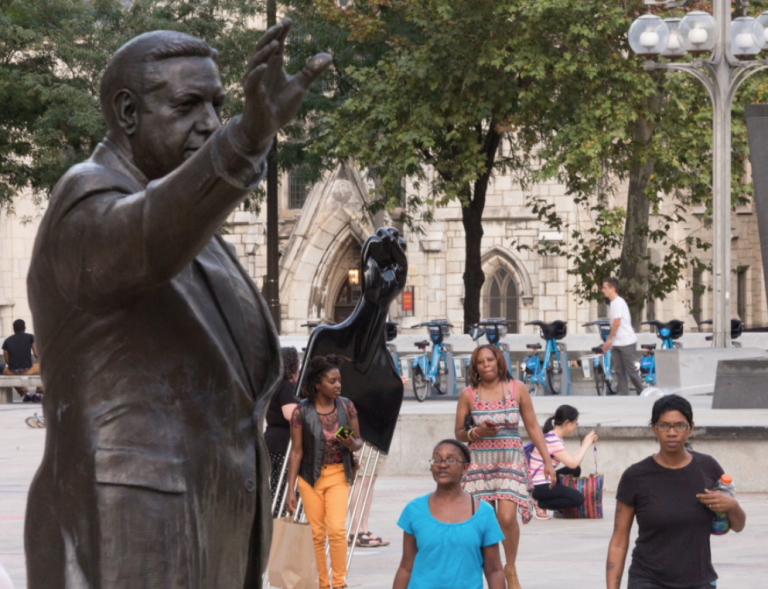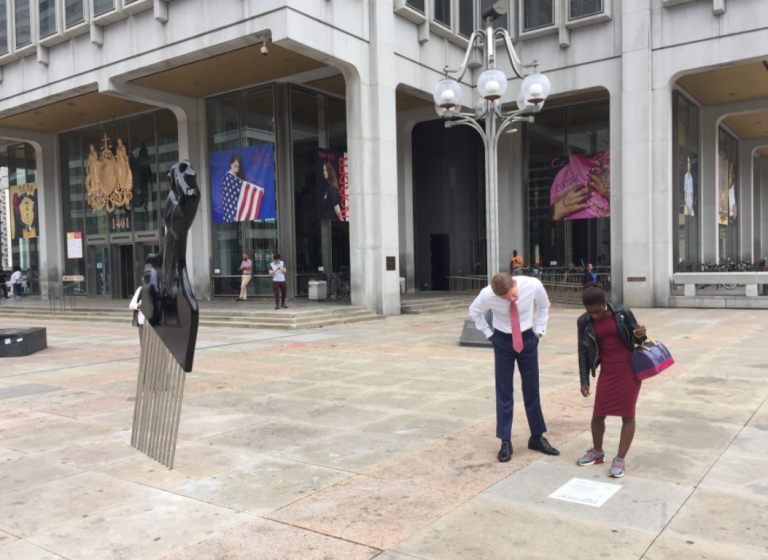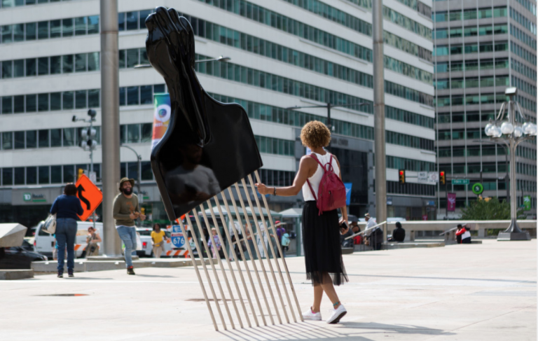 “All Power to All People” was one of the temporary artworks displayed during this time, on Thomas Paine Plaza directly across from City Hall and in very close proximity to Claes Oldenburg’s Clothespin and Paint Torch, Jacques Lipchitz’s Government of the People, and Zenos Frudakis’s statue of former mayor Frank Rizzo. The proximal relationship between Thomas’ piece and the sculpture of Rizzo shined a bright light on just what gets commemorated in our shared public spaces. Rizzo was a known racist and the sculpture was a gathering point in Philadelphia for Black Lives Matter protests after the murder of George Floyd in 2020, and removed shortly after. A statue of Octavius Catto, the first monument in Philadelphia that was dedicated to a historic person of color on public land in the city, was installed the same month as All Power to All People Thomas’ sculpture showed that we can challenge form, material, context, and content in memorials and monuments across the country, and denoted the lack of commemorative statues that address equal justice and belonging and drew a contrast to existing sculptures memorializing figures that perpetuated inequity and violence in their time.