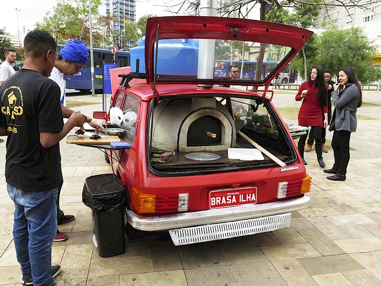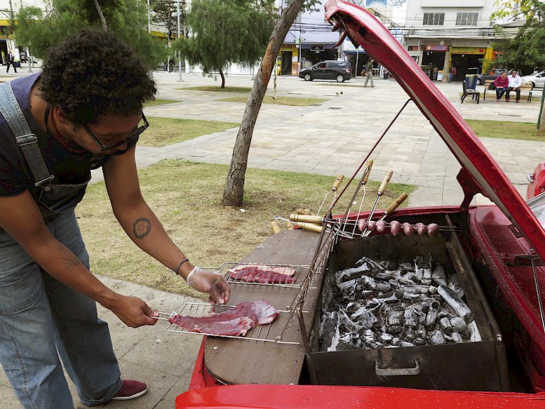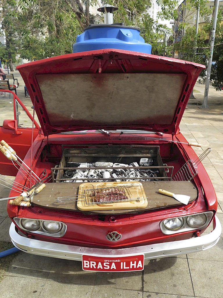 Brasa Ilha works with easily recognisable elements - this is done as a critique of what is considered low art and high art: composed of a barbecue, car, and a pizza all elements very present in everyday life. A collage of these comes together to make a bigger statement and give new meanings to banal objects. How can we rethink the patterns of our daily life when we encounter such a thing as we are walking on the street? Where is the value in desacralizing the art experience? OPAVIVARA! are concerned with empowering the audience to become part of the work – for them, the moment the work is working best is when it works on its own.