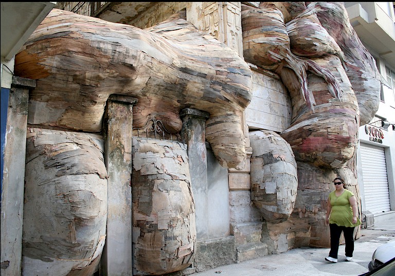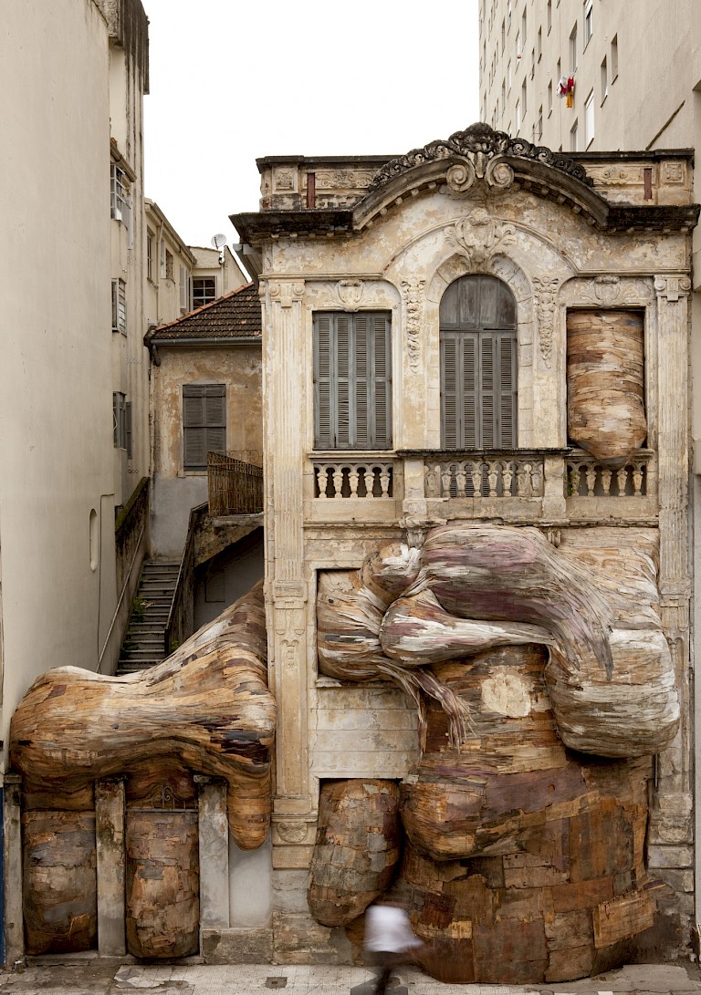 The process of construction is an important aspect of this larger conversation, according to Oliviera. The artist gathers scraps of plywood fencing from dumpsters and other trash sites. The layers of plywood are peeled apart and then re-glued into his distinctive organic forms. Oliviera describes this as a process of “returning the material to its original place—the street.” Instead of the “aseptic environment of galleries and museums,” he says, “in this project, the materials had a harmonic integration with the building’s aged walls,” which supported the illusion that the sculpture “grew from its interior.