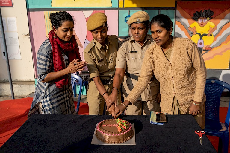 Indu conducted various outreach programmes- monthly Women’s safety workshops in the local anganwadi (a government centre to provide free education and food for kids under 3 years and nutrition for pregnant women). Indu attended the local BBMP ward meetings every month. She created Whatsapp groups in the community to reach out. There was a news channel style video created to share and play in local barber shops & bars. She circulated pamphlets in the local newspapers. Indu also visited various schools, yoga centres and presented the project. Every aspect of the project’s materials (shaman, tea, cake, stationary, flowers, dress for Cecilia, photo and video etc) were acquired from the people in the area.