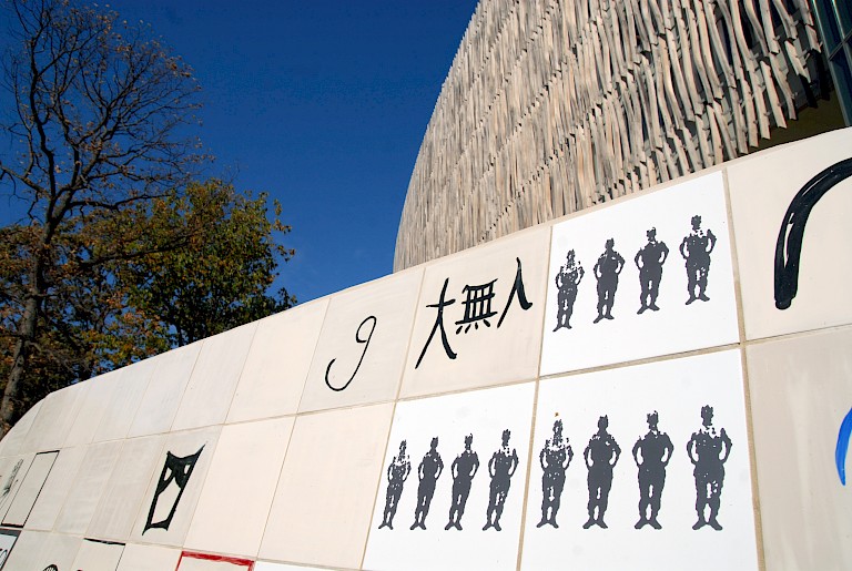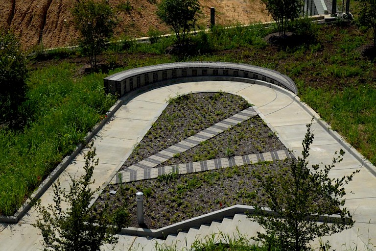 Illustrated, tiled slabs nestle among green plantings and grass. These grids depict screen-printed photographs of hundreds of faceless, nameless, generic human figures dressed in T-shirts and jeans, arms akimbo, confronting the viewer. The figures are overprinted with integers running endlessly, repetitively, from 0 to 9. A brick bench in the shape of the numeral 1 sits between two halves of an earthwork referencing Native American burial mounds. On each earthen hemisphere, hand-painted tiles chart numerals from Native American corporeal, or hand-based, numerical systems. Arabic, Chinese, and other numerical systems cover walls throughout the walk. The synthesis of image, language, and text is graphic and immediate in its ability to communicate diversity.