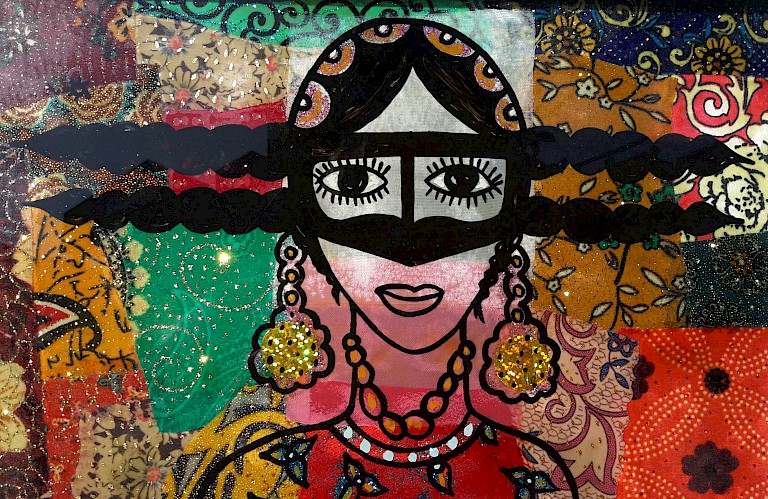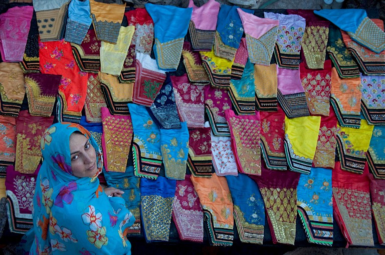 In this project, colorful pieces of clothes were attached to the surface of a sheet of glass. Due to the thin and transparent texture of these clothing items, the "blanket" of pieces comes together to create a colorful, shining view when exposed to sunlight—almost like stained glass. The use of various colors in the structure and texture of women clothes in southern Iran is an obvious reality. The artist was attracted to the way in which southern Iranian women select, match, and design the colorful patterned garments for their traditional clothing.