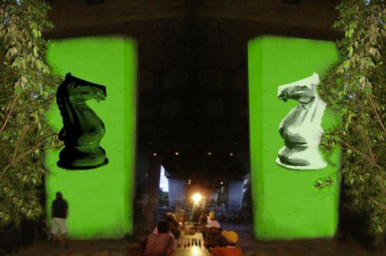 In order to authorise the site, two column of highway structure was painted by mural painting of two black and white chess piece complemented with the chess community title. Moreover the park is equipped with portable table that has chessboard painted on the surface along with seating arrangement that was designed to accommodate 16 people. As an anticipation attempt of sudden police raid, the community requested the table leg to be detachable.