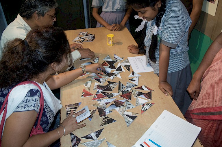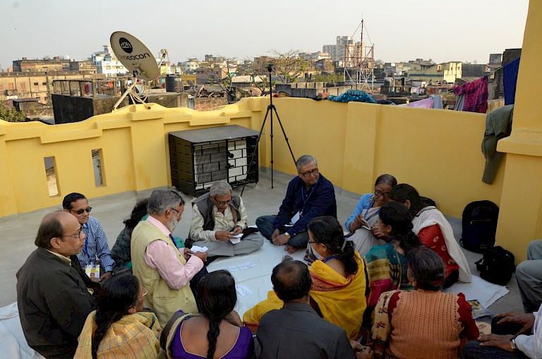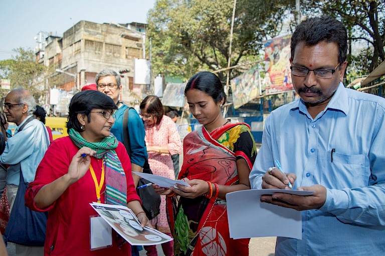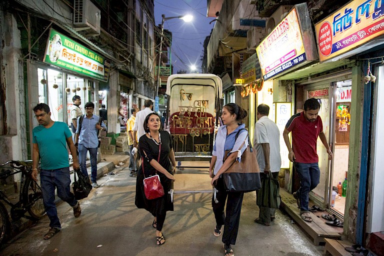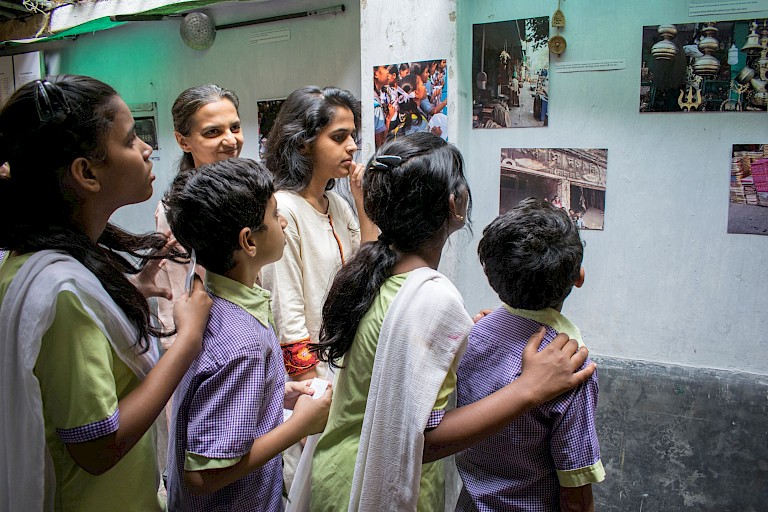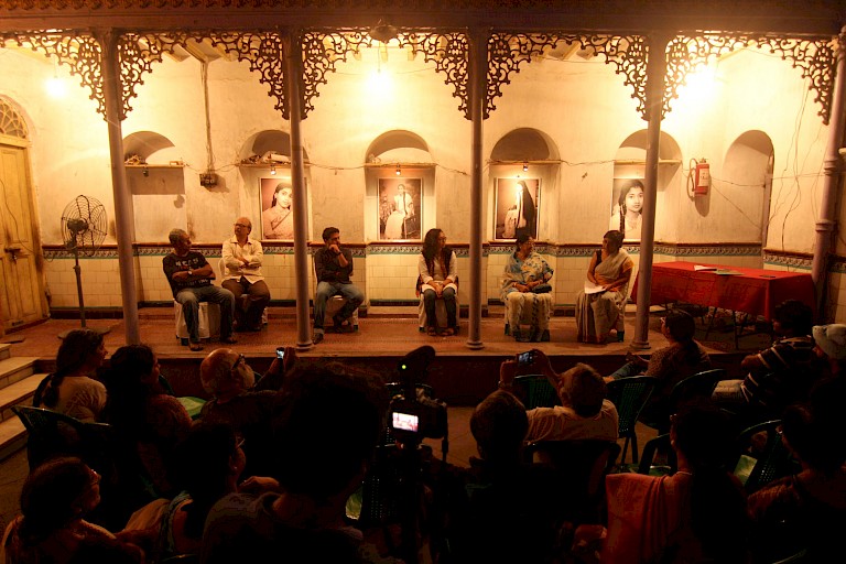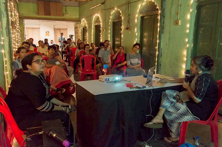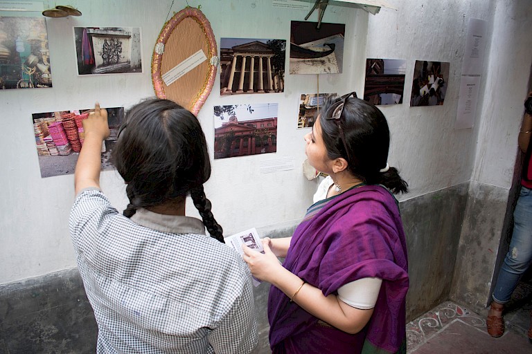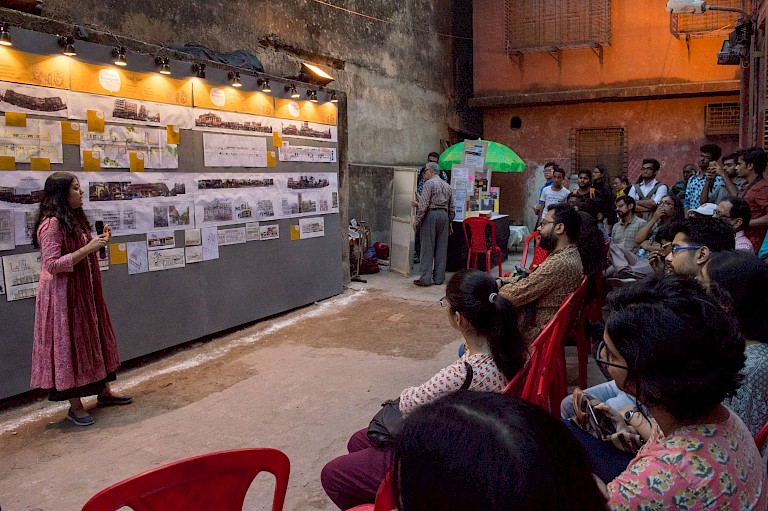 The project currently has two phases: The first from 2013 - 2016. is centered around one particular neighbourhood- known as Jatrapara, or Battala, which was the hub of popular traditions like Jatra (travelling theatre), printmaking, publishing, jewellery-making and bamboo crafts. It is also a neighbourhood with a history of shared spaces - private courtyards, bookshops, public street corner rowaks (platforms) that were once the focal points of interaction and cultural engagement. Starting with mapping the area, and moving on to pop-up museums in courtyards of the large homes, the project constantly included community members as co-artists, producers, advisors and storytellers. These efforts led to a public art festival in March 2015.
