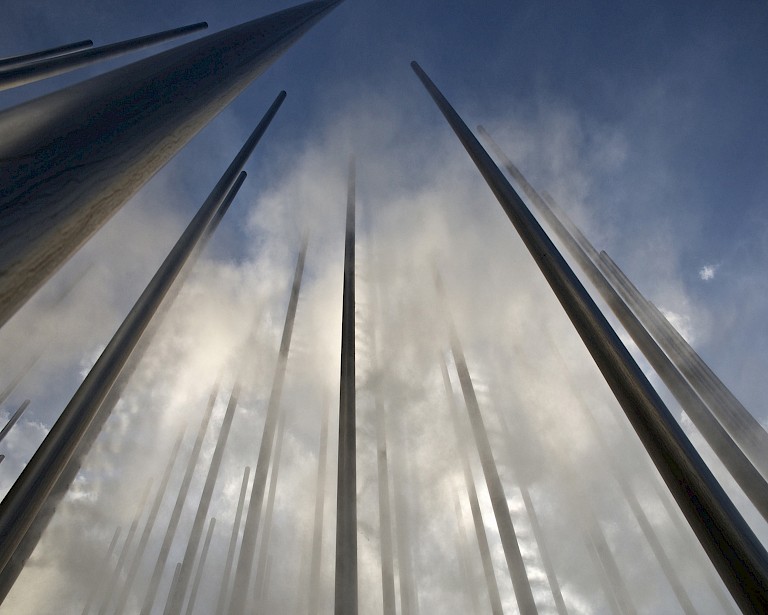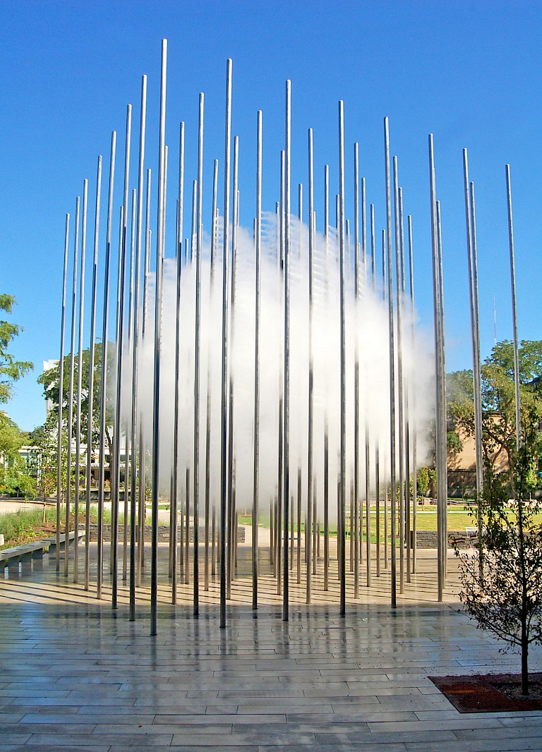 The sculpture is a beacon for how public art and design can work hand-in-hand to create great public space. According to Andrea Cochran, the poles are spaced at four-foot intervals to encourage visitors to move through the sculpture and to create a sense of permeability with the rest of the park. In addition, the sculpture is sited along one of the park’s major, cross-axial pathways, aligning it with the entrances to both the Children’s Museum and the office building on the south side of the site. A pedestal system allows water to drain through the pavers without ponding and creates a void below grade to house the electrical conduit and water lines that run to the sculpture. The artist and designer worked with lighting designers to create a custom in-grade light support within this subsurface zone, integrating the fixture layout into the grid of poles and pavers, creating a public space that is not only enjoyable throughout the year, but also at different times of day. To provide for the long-term sustainability of the renovated park and its artwork, the Children’s Museum and the City of Pittsburgh share the responsibilities of maintaining, repairing, and protecting the park. The Children’s Museum has also created an endowment to help pay for the upkeep of Cloud Arbor. Due to its use of water as a scientific and artistic wonder, ongoing maintenance of the nozzles and the fountain is critical to the long-term success of the installation. This endowment and the park redesign are considered gifts to the city by the museum.