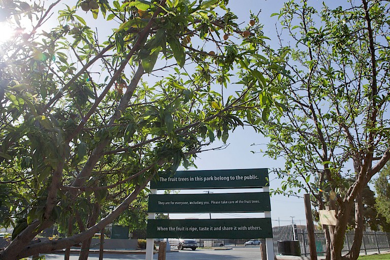 In addition to serving as a meaningful public art project in its own right, Del Aire Public Fruit Park functioned as a testing ground that gave L.A. county confidence to further welcome fruit trees on public spaces. Additionally, the project underscores the intertwined nature of public and private realms, as well as the ways in which communities can be reconceived as nourishing spaces. In this vein, it fits alongside initiatives related to healthy and locally sourced food, as well as within an arts and activism landscape that ranges from Guerilla Grafters’ rogue interventions to add fruit bearing branches to public plantings to Fritz Haeg’s Edible Estates, where participants transformed their own front lawns into nutritious gardens.
