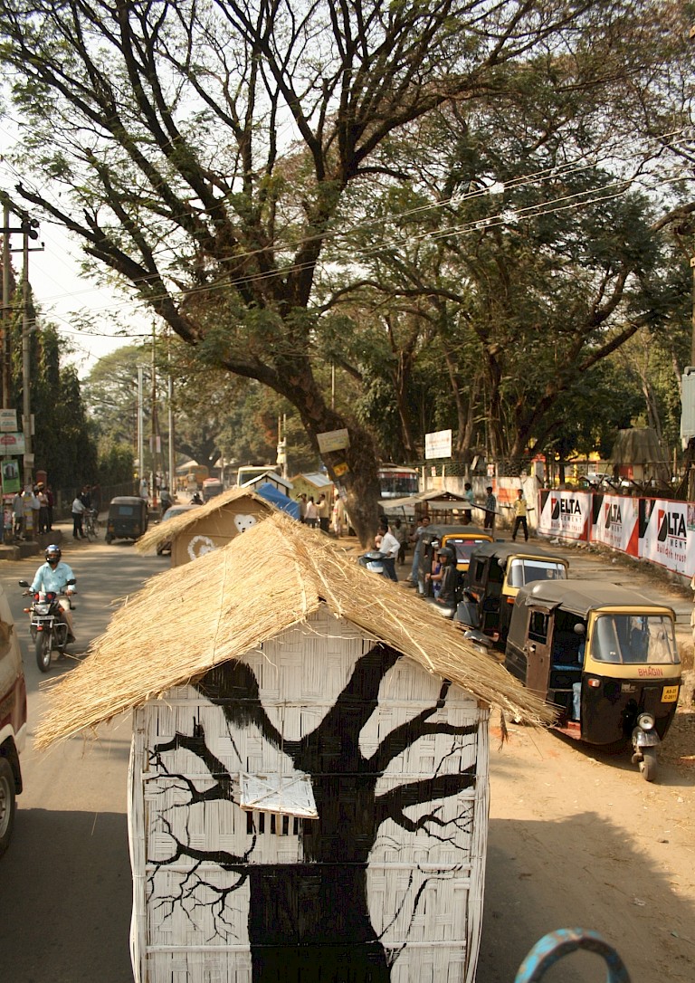 The five houses themselves were adorned with symbolic references. Each represented a specific theme. Thus there was a Sufi house, an urban house, a house of displacement, a house of social norms, and the Kankhowa’s (actor’s) house. At the conclusion of the procession on the banks of the Brahmaputra River, the houses were installed on site, and a number donated to homeless families in the area, a fitting final act for a work that dealt with the notion of home. While it is difficult to objectively ascertain the extent to which the procession engaged audiences in reflection on the notion of different kinds of houses and homes, and indeed, on the idea of the body itself as home, it is conceivable that these notions were not lost on at least some of the public, not least, the homeless who received the gift of housing, and those who witnessed this generosity.