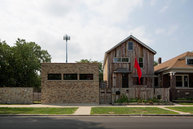 In 2006 Theaster Gates moved into Chicago’s Greater Grand Crossing neighborhood, which was suffering from economic downturn, with the idea of creating a possible “residual effect” throughout the area via his own presence and property maintenance. Nation-wide, however, economic hardship and the impact of the housing market crash intensified, and one by one, neighborhood properties were vacated. To counter this exodus, Gates envisioned revitalizing the neighborhood by turning empty properties into arts and community spaces. With his own money, he purchased and restored the property adjacent to his own, using locally recycled and salvaged materials when possible. He then installed 14,000 art and architecture books from a recently closed local bookstore and a collection of 60,000 archived glass lantern slides donated by the University of Chicago’s Art History Department.