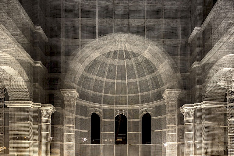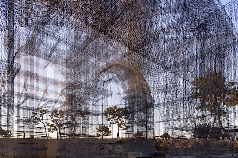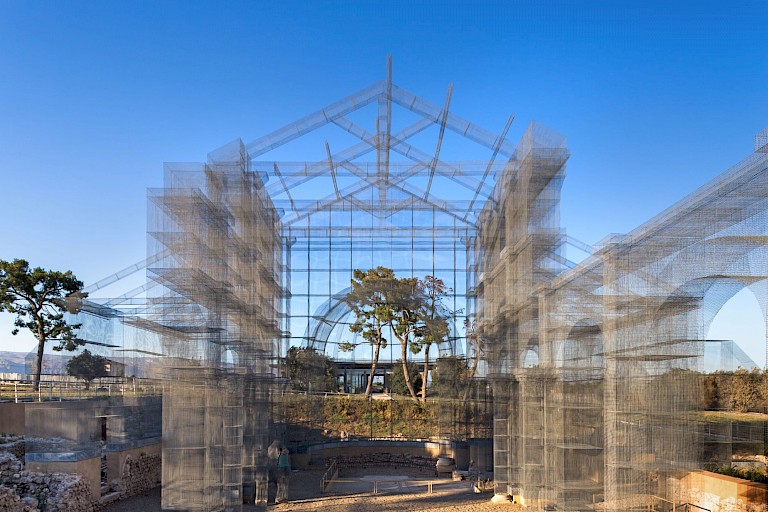 The art intervention in Siponto Archaeological Park reinterprets the volumes of the ancient Early Christian basilica, located close to the Romanesque church which was erected 600 years later. According to the artist, ''the majestic transparant wire mesh sculpture, presents itself as a contemporary artefact perfectly integrated with the surroundings, and establishes a new dialogue between ancient and contemporary times, opening up new scenarios for preservation and enhancement of the historical and archaeological heritage. Detached by strong visual and volumetric decompositions and cherished by the atmospheric factors, the installation acts as a bridge to the memory of the place and allows the public to relate with time and history''.
