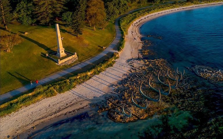 This art work combines ancient and modern Australia’s shared history by integrating the stories from the ship and the shore into a single artwork. The first encounter between James Cook and the First Australians was a meeting of two very different knowledge systems, beliefs and cultures and the abstraction of the ribs of the HMB Endeavour and the bones of the Gweagal totem the whale, are devices the artists intend to speak to the different perspectives of those first encounters, providing a conjoined narrative of two very different world-views. The artists worked closely with the La Perouse Aboriginal community via the Gujaga Foundation to gather local histories and contemporary stories, later cocreating designs for the sculptural artwork, intending the resulting artwork to embed refreshed and revived narratives of history and connection to the land at the Meeting Place, strengthening the significance of the Kamay site to all.