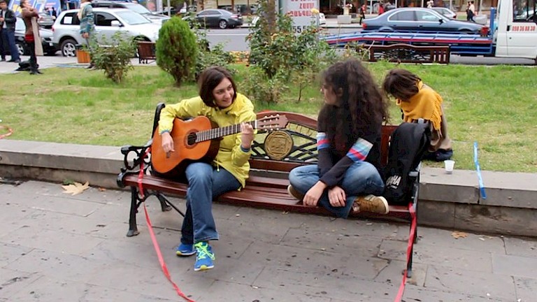 FREE SPACE international forum has been held in Yerevan with about 15 events around the main theme of democratisation of public spaces and empowerment of women. Activists and researchers from 7 different countries participated at the forum and provided a platform for discussions, exchange and networking concerning issues of (re)claiming and designing democratic, free public spaces and the safe presence of women in public spaces. The Karen Demirchyan park, known as the «Malibu park», is an abandoned public space in the very heart of Yerevan, near Mashtots Avenue and which we aim at co-designing and co-using through this event. The project aim has been that of shaping democratic, participatory, diverse public spaces in Yerevan, by facilitating informal education for disadvantaged women, raise awareness on strength of the organized social mobility of women, and enhance their civic culture and rights-based claims. Art + Activism organizers asked female members of the audience to walk from one side of the lecture area to the other if they had ever experienced any of the following unwanted interactions from a man on the streets in Yerevan: staring, stalking (by foot or car), inappropriate dialogue, or any other form of harassment. Street harassment is an enormous problem in Yerevan and stems largely from an entitlement over public space that men naturally feel in a patriarchal society. Art + Activism has overcome this obstacle by creatively combining action with interaction in their latest project: an interactive crowd map called “Mi Lrir” (Don’t Be Silent). he concept for Mi Lrir is an incredible example of creative problem-solving. It documents in real-time from real women what is really happening on Yerevan’s streets. An interactive map (see https://milrir.crowdmap.com) tracks incidents of harassment on the streets by allowing women to place “pins” on locations where real harassment of some kind has happened to them. The severity and degree of harassment is indicated by different colors; for example, a purple pin refers to harassment that took place on the street, while a blue one indicates it happened from a vehicle. During the forum, organizers provided a real map to introduce the concept to the audience, and allowed them to begin indicating their experiences at the forum, which would later be uploaded to the website. The project has only been active for a few days and has already had 24 stories uploaded by women in the community. Following the introduction of Mi Lrir, organizers allowed participants to engage in an empowering creative activity they called, “Respect My Space,” which emphasized n a very literal way a woman’s right to not have her space invaded by outsiders.In plain view, on Mashtots Avenue at the entrance to the park, each woman was given a roll of colored tape to mark her personal space wherever and however she deemed appropriate. In this space, she was free to do whatever she wished, anything from practicing yoga to writing an e-mail.If approached, even if out of sheer curiosity, participants were instructed to respond, “Yes chem uzum khosel, harkek im taratskuh” (“I don’t want to talk, please respect my space”). Outsiders were not entitled to enter participants’ space unless given permission to do so. The activity gave women in Yerevan’s community permission to practice assertion and solidarity.