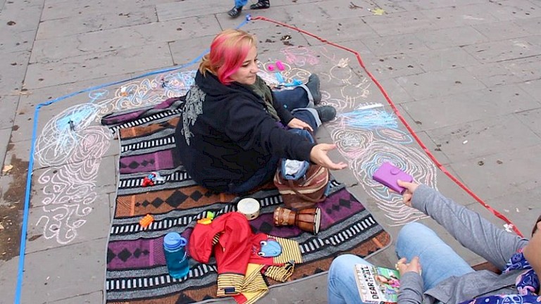 Each woman who participated to Respect my space public actions chose her own space in the area, its size and shape, and whether or not to invite someone else to istay inside it. Then they marked it with colored tape by codifyng the space with their own body and activities. T hey used their space in different ways, like making yoga, reading, singing, talking, embroidering, dancing and playing with other ways of expression. Some new rules were established before the intervention, for example, if someone tried not to respect the space all participants would surround the person without speaking and would oblige her to have a better behavior. But that didn't happen and women felt safe and strong.