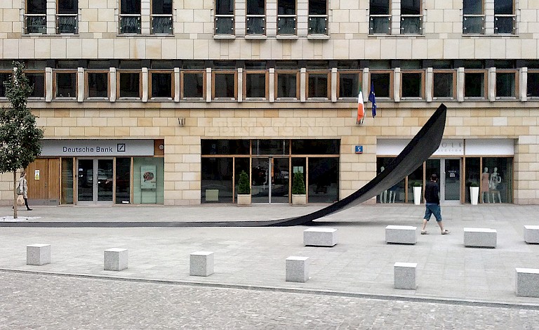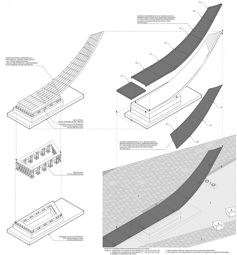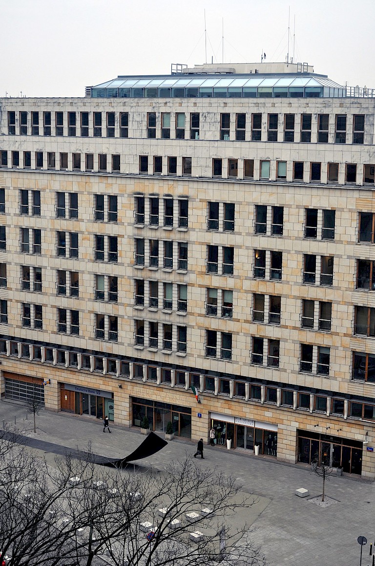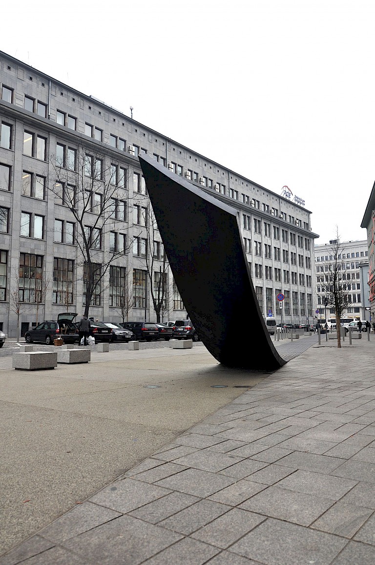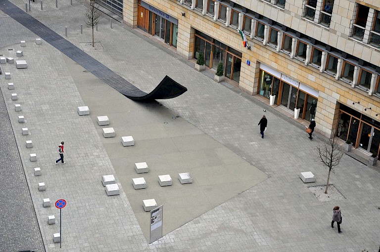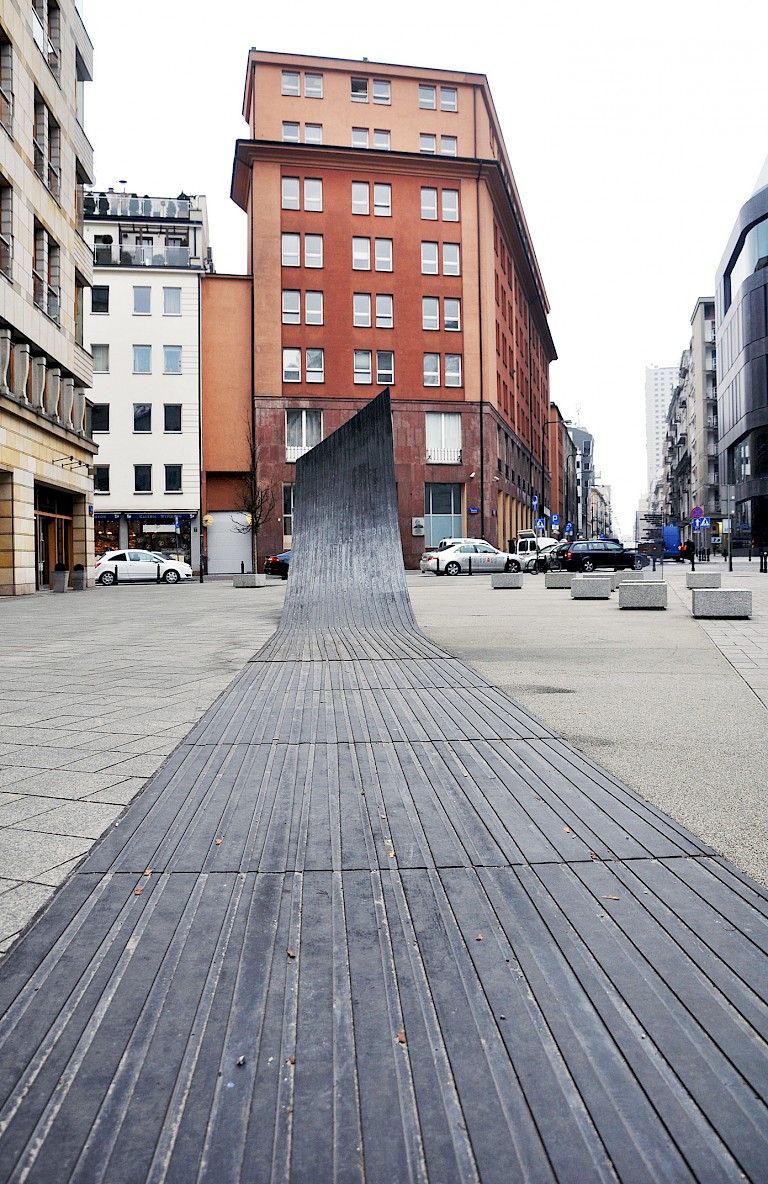 The artistic project for the memorial was selected through the open competition organized by the committee in cooperation with the Public Areas Board of the Capital City of Warsaw. During the ceremony of the announcement of the winning concept, the organizers also held an art auction that provided additional funding for the Memorial. The competition was won by a group of artists and architects: Katarzyna Brońska, Mikołaj Iwańczuk, and Michał Kempiński. The monument constructed according to their project was unveiled on June 5, 2014. The Free Speech Memorial has the form of a 90-metre-long black censor bar and is made of concrete on a steel structure. It traverses the eponymous Free Speech Square in the centre of Warsaw, running from the outlet of Mysia Street to the Polish United Workers' Party Central Committee building, along Mysia Street and up to the entrance of the former censorship headquarters. Here, the black belt «peels off» the surface of the square, symbolically releasing the word — revealing the hidden, erased content. As a result of the fight undertaken by thousands of people, the censorship line is cut. The bilingual (Polish and English) description of the monument and its historical context is printed on the transparent vertical plate.