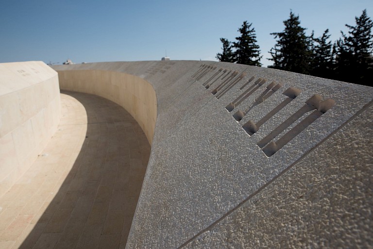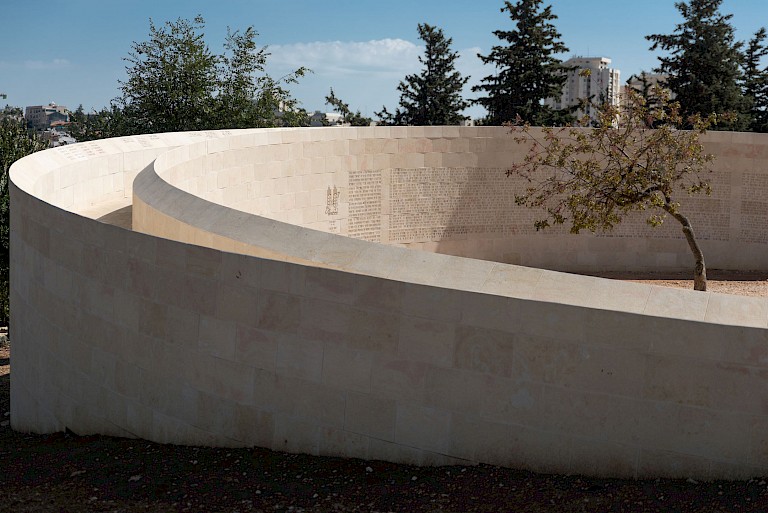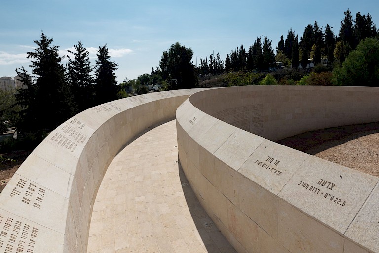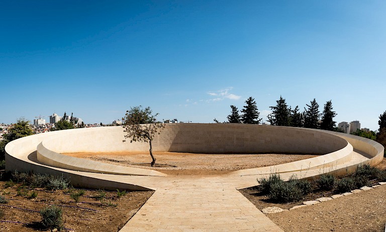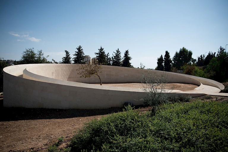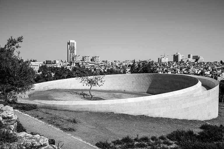 Like many of his other works, Gan Harel is a large scale environmental sculpture that addresses or responds to the history and qualities of a specific urban space. Composed of vegetation and limestone, Gan Harel encloses part of the Saker Gardens (one of Jerusalem’s largest parks in the central city) in a large rounded form. Beginning at ground level, the circle’s elevation gradually rises to form a wall and walking path; the names, ages and battle places of fallen soldiers from the Brigade are etched across this wall. The highest point of the wall offers to visitors a view of Jerusalem, while a single Pistachia tree stands within the enclosure, a minimalist gesture much in keeping with Karavan’s aesthetic sensibilities.