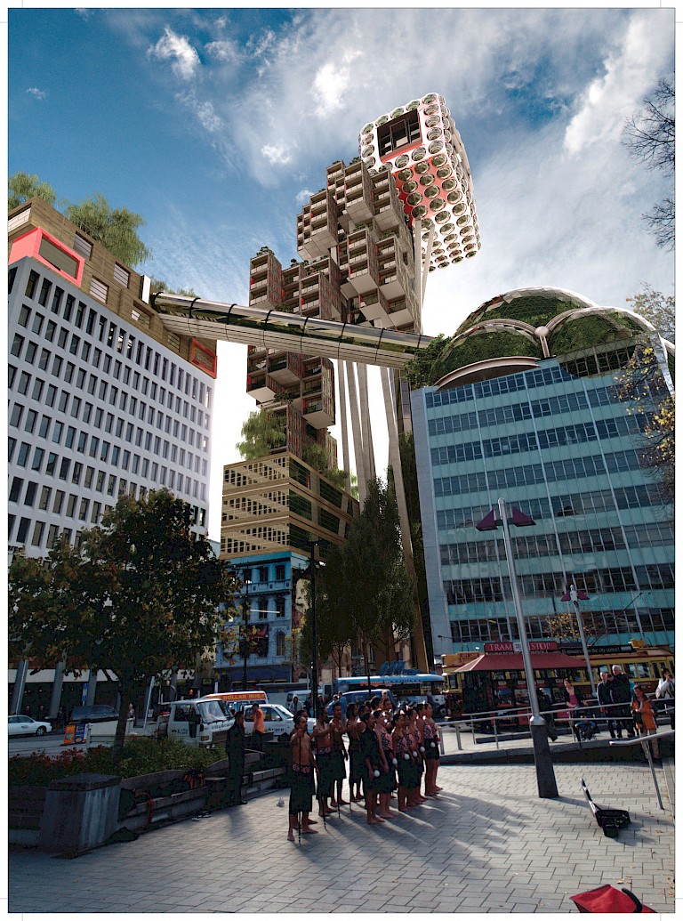In Gardensity, Christchurch’s Government Life Tower building was reimagined and transformed into an agglomeration of geodesic domes housing a rainforest and winter garden, restaurant, and café. The Sevicke Jones was repurposed to include cafes, bookshops, and design stores on the ground floor and studios and apartments above. The Harper building was turned into a space that could be used as a gallery, museum, environmental research center, or urban laboratory. Some adjacent vacant land was transformed into a public space with a native forest and glass elevator towers to provide access to all levels of the development. The Sky-Loft building of Gardensity was open to several possible uses, such as a library, planetarium, offices, restaurants, and relaxation rooms.