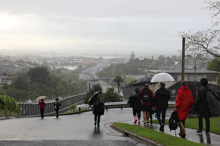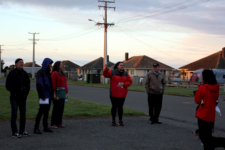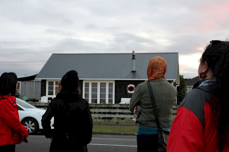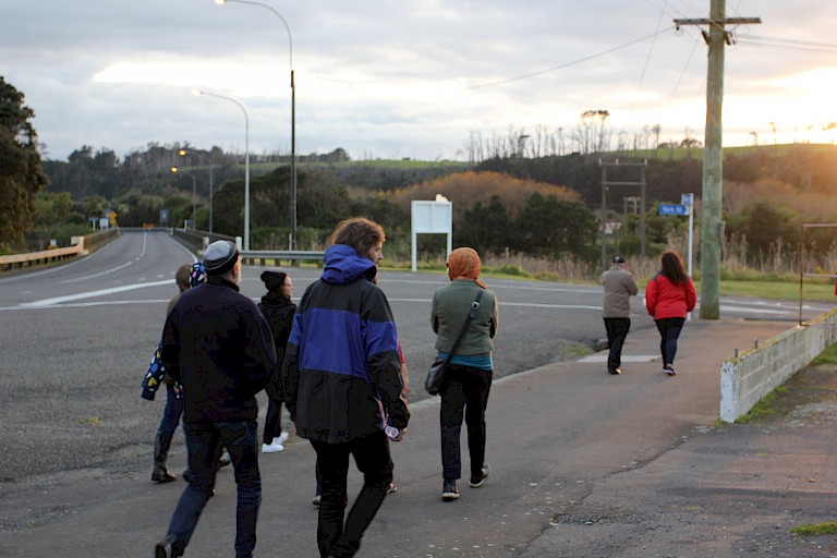 Generation Exchange (2016) consists of two participatory walking performances by Apelu that invited people to join in as a way of embodying personal histories of the artist’s family. The first performance took place in the small township of Patea (population c. 1,000 people) on the West Coast of Aotearoa-New Zealand’s North Island, sharing insight to the lives of artist’s maternal European ancestors. The second walk took place in our largest city, Auckland, and traced memories and the journey of Apelu’s paternal grandparents who came to New Zealand from the Pacific Island of Niue. Both occasions exchanged local knowledge as well as family stories and experiences, allowing the artist to explore and share her heritage with strangers.