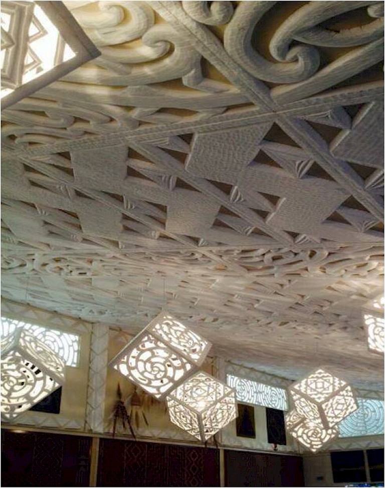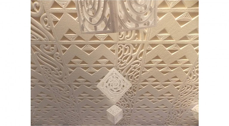 Carving is highly prized in Maori culture and Nuku presents a contemporary face to an ancient art form, offering a 21st century reinterpretation of materials and marae decoration. Nuku sees this as part of his role as an artist in the continuum of a vibrant, living and dynamic Maori culture, commenting “Tradition is about the ongoing process of being innovative….I want to make things my ancestors haven’t seen before… I can’t just photocopy what they did… I don’t think they want us to do that. We need to realise there is a divinity to every material, to every thing”. While Nuku’s shaped and etched Perspex works can appear as ghostly sculptural offerings, the polystyrene toi whakairo (carvings) express complex political and cultural ideas in strong sculptural forms. The carved ceiling in the wharekai Ruatapuwahine (dinning hall) is a metaphor for the cloak of Ruatapuwahine, a female ancestor of Nuku’s tribe. Acting as a cloak, the ceiling is understood to protect and nurture her tamariki (children or descendants) and the marae’s manuhiri (visitors). Many traditional carving patterns are used, the art work offering ancient koru, pūhoro, kaokao, niho taniwha and mangopare patterns in a contemporary execution.