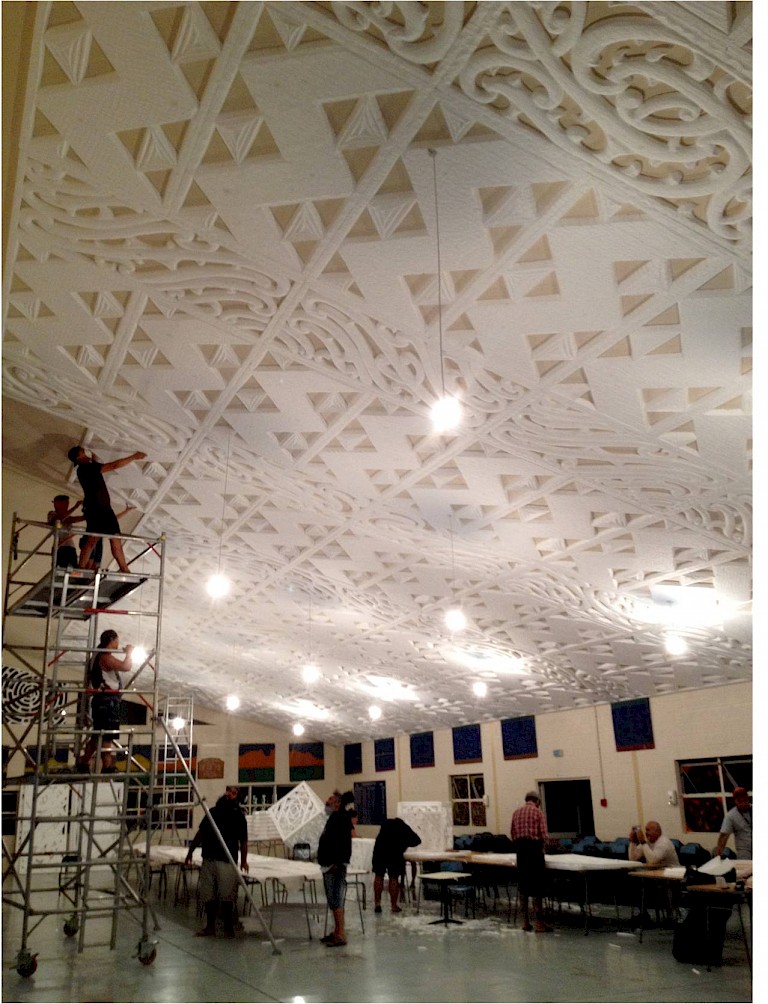 This project arose at a meeting held at the marae back in November 2013. George Nuku and his brother Darryl spoke to the hapū about how to solve the acoustic problems in the wharekai, proposing a polystyrene ceiling and community involvement. At the following Omahu Marae Trust meeting in December 2013 the project was approved. It took a period of 5 weeks over December 2013 and January 2014 to complete the whole project, including planning, designing, carving and installation.