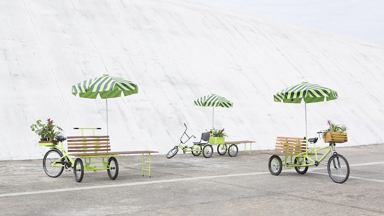 Thinking about this scenario presented, the collective BijaRi, formed by Rodrigo Araujo, Geandre Tomazoni, Gustavo Godoy, Maurício Brandão and Olavo Ekman, including architects and artists always on the radar to different media platforms, were concerned to develop something to try to meet this demand to create an alternative temporarily converting empty square in São Paulo, developing mobile installations using umbrella, retractable benches, planters, and an adapted bicycle makes mobility possible, concluding with a kind of micro public square. Having the flexibility to articulate, come together and create larger living spaces, providing a series of pattern designs in lenticular panels that change according to the angle at which you view. To this work it was given the name (Im) Possible Squares (Praças {im} possíveis), creating an allusion on squares that could exist but are unoccupied points, which is the collective for a moment to have this function.