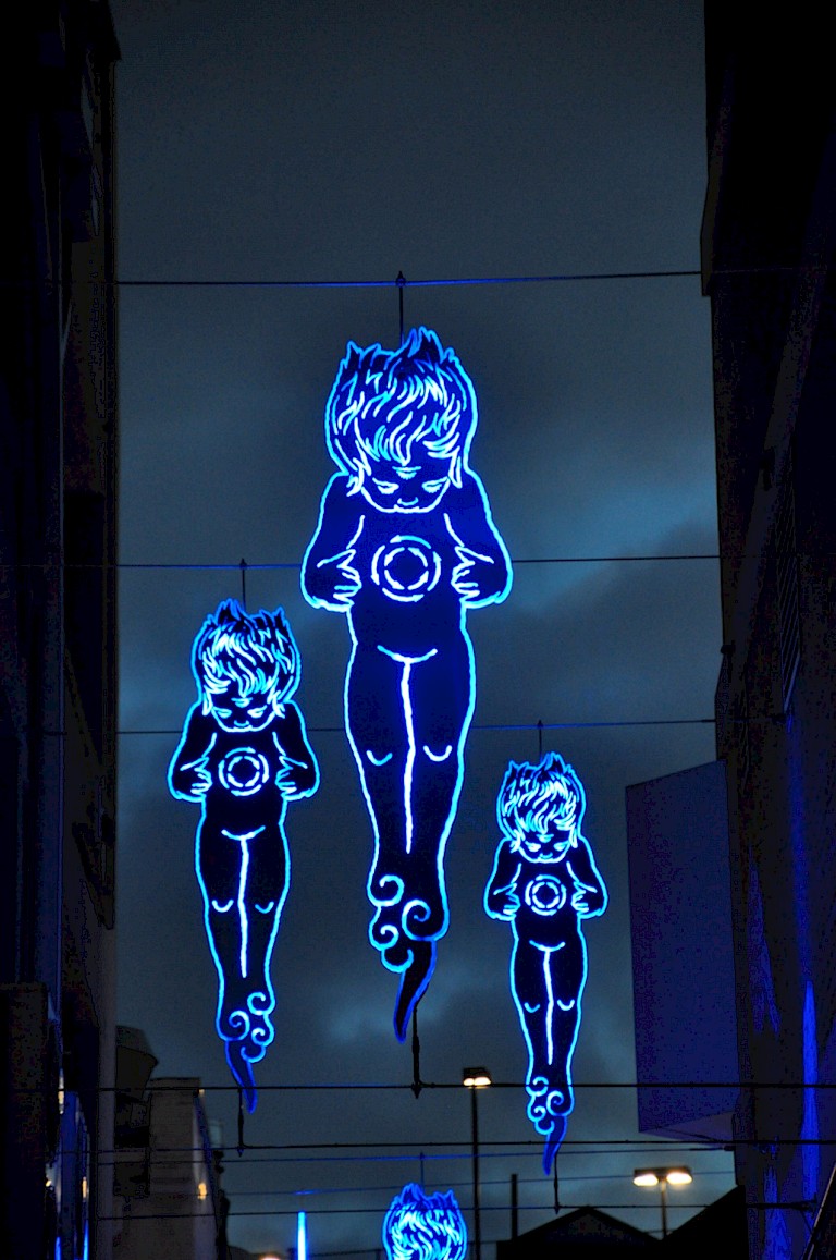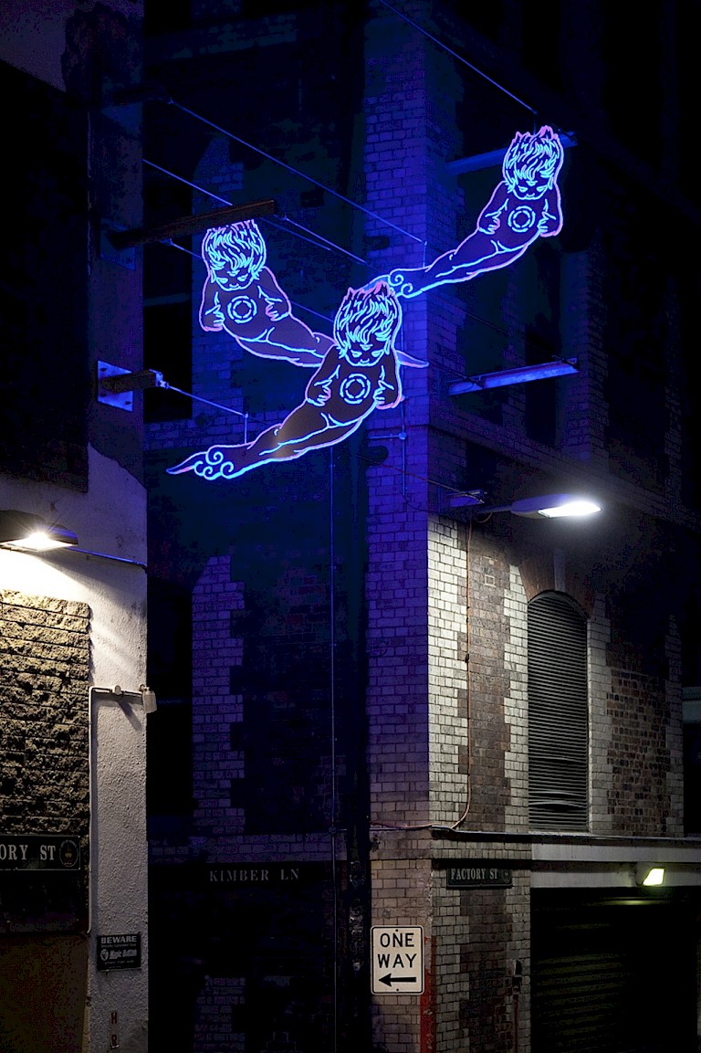 Incorporating the elements of wind, water, fire, and earth, the artwork brings important Chinese and Aboriginal cultural motifs to inner city Sydney. In both cultures the elements are said to have their own spirits and in the Chinese Zodiac humans were created with the characteristics of elements. The half human, half spirit figures Wing has suspended above Kimber Lane reflect this, representing past, present, and future ancestors. Suggesting heaven and earth, the elements, and respect for ancestors past and present, Wing evokes universal themes and allows the work to open more widely, offering points of connection between other cultures.