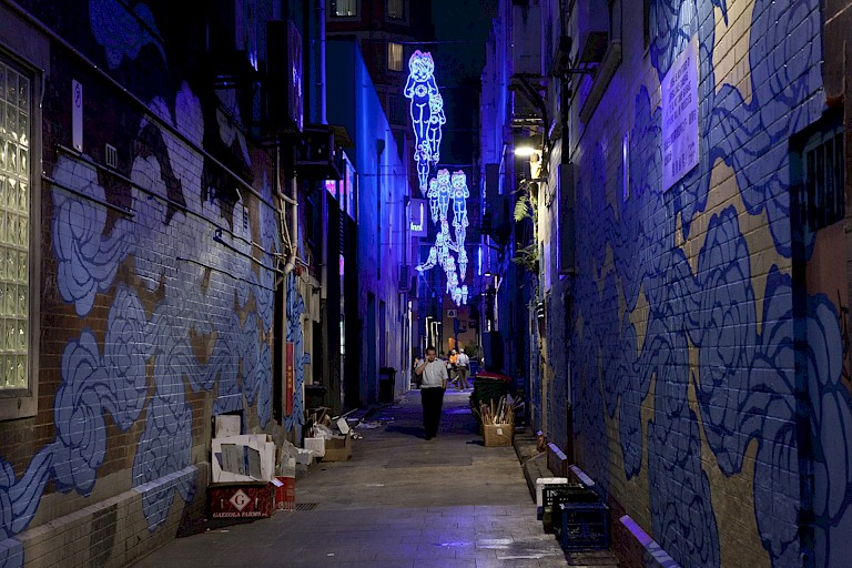 The artist’s multicultural heritage gives him a unique perspective on the site, its history and how it functions within the city of Sydney. The work feels like a digital game at times, especially when illuminated at night, as it incorporates a contemporary aesthetic mixed with recognizably Asian motifs. While In Between Two Worlds offers many points of connection for its audience, it also is something of a rupture in public art practice in this area. In the past public art in Sydney’s Chinatown has been formulated within a representational mode of ubiquitous and clichéd elements, such as lanterns and red lighting. While it is important to recognize and locate the Chinese community living and working within the precinct, this aesthetic does little to recognize contemporary Asian culture and its constant evolution. In Between Two Worlds readdresses that, offering a striking and much loved public artwork by a young, multi-racial Australian artist embracing a new dynamic.