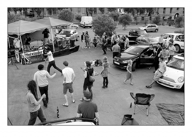 Over a period of three years, a sample of forgotten spaces were identified in Johannesburg and several one-day public interventions were carried out in their midst. These ranged from a parking lot that was turned into a pirate radio drive-in, to the burning of a defunct piano on a building rooftop and creating a new musical composition from self-made microphones embedded in its innards. The venues within buildings were also always transitional spaces - like the rooftop, stairwell, hallway, facade. Invisible Cities was part of a constellation of initiatives that notably included Invisible Cities Radio, which is a pirate radio station that broadcast to Johannesburg inner city and which generously lent itself to off-beat artistic collaborations.