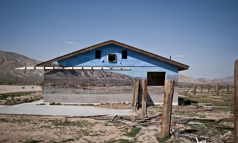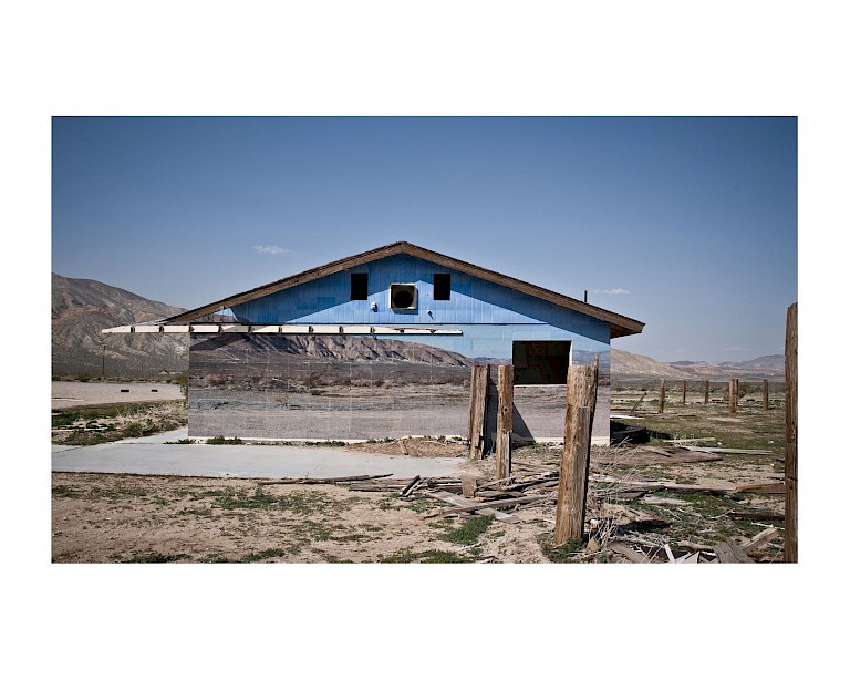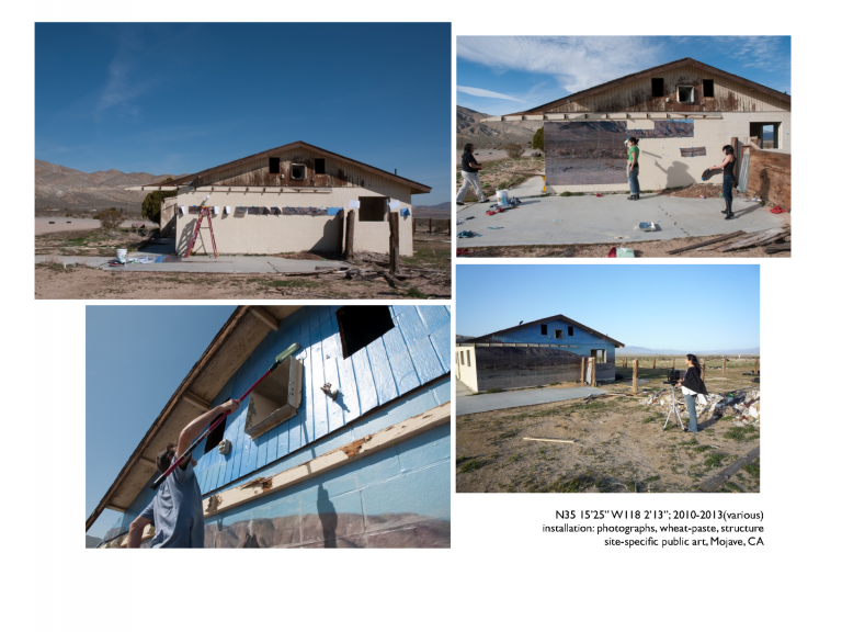 These "invisible" interventions are about erasing demarcations in the land. Adding material to cause erasure, the piece allows the viewer to have a physical experience in/with a solid space but to see the possibilities of what once was untouched. Some of these interventions cause invisibility, while others show the eventual deterioration of the object/location. The mojave site was located abandoned compound in the Mojave desert. The work is meant to be ephemeral in nature and change as the environment so chooses. The photographic studies were taken over the course of three years, 2010-2013, the structure is no longer present, but the remnants of the work are saved along with images of the process.