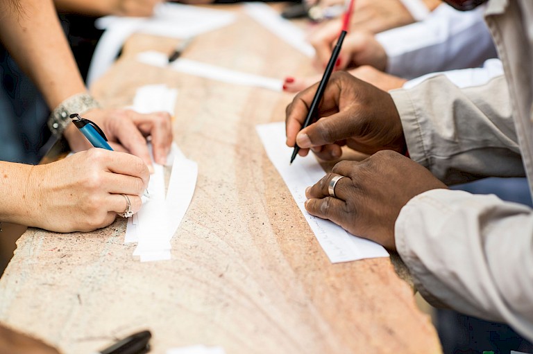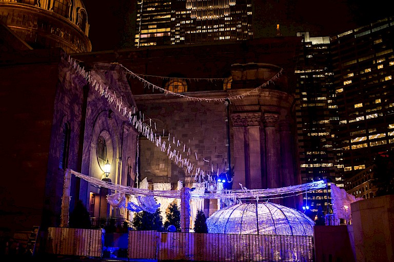 Artist Meg Saligman began with the painting as inspiration for exploring the dynamic between the individual and the collective in the context of personal struggle. Speaking of the structure itself, Saligman highlighted the function of a grotto as a space of shared prayer and communal gathering. In inviting participants to identify their own struggles, articulate them to a larger audience, and acknowledge the struggles of others, the project established a relationship between participants that symbolically enacted an essence of the painting—the act of seeking help outside oneself and the awareness that even in struggle, one is not alone. While rooted in communal efforts to alleviate homelessness, the meditations shared in Knotted Grotto ranged broadly from family tragedies to drug addition to more general well wishes.