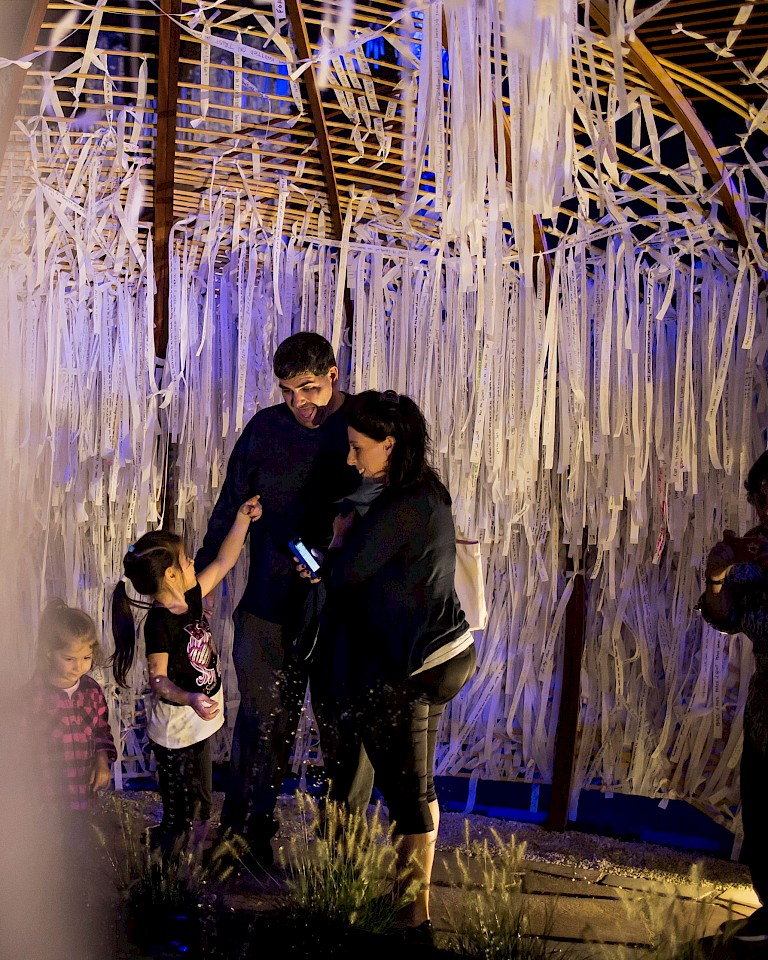 Saligman is committed to community involvement and strove throughout the project to create pathways for participation, particularly in making it possible for people who could not travel to the site to share their struggles and be included in the work. As a result, Knotted Grotto is notable for the sheer number of participants, but also for an unforeseen quality that developed over the course of the project. Saligman noted that in leading up to the work, she “hoped that people would be connected to an energy greater than themselves.” As engagement around the project built, Saligman noted a meditative, energetic quality of the space, commenting, “I’ve never experienced something that wasn’t there being so palpable.” Speaking to the placemaking component of the work, she described Knotted Grotto as the creation of a container for holding struggle, as well as a piece that hinged upon mutuality of transformation—a shift in the environment, a transformative experience for participants, and a lasting impact on the artist as well.