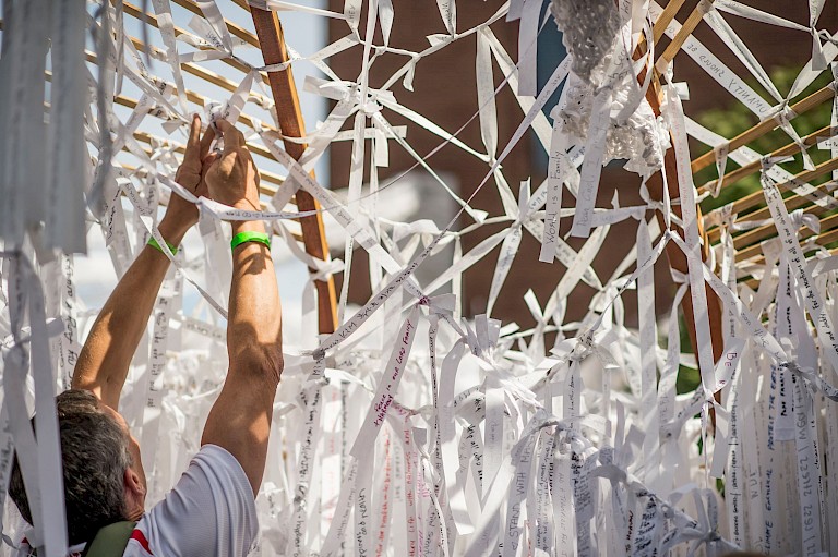 The grotto served as a central gathering space that featured a copy of the painting, Mary, Undoer of Knots, but it was also part of a carefully crafted environment with landscaping, hand-built tables for writing, a fountain, nighttime projections, and strands of ribbons extending outward and connecting to surrounding structures. Originally envisioned as a place-based work, interest in the project grew and inquiries began coming in to the artist’s studio, asking how those who could not physically visit the work could participate. The studio created a machine to cut mural cloth and began mailing out ribbons and adding the struggles sent back to structure.