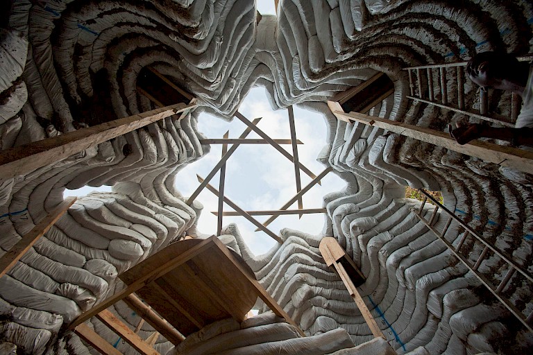 It was collectively decided that the foremost needs of the townspeople was a public community space where citizens could meet, classes could be taught, and other planning and programming could take place. Working through a collaborative process, the group designed, built, and adorned an earth-bag structure from local dirt mixed with concrete, or “Super-Adobe,” a process developed by architect Nader Khalili, one of the team of artists on the project. Since the community center was completed, the group has built two additional structures to serve as single-family homes.