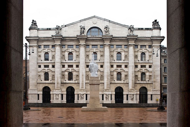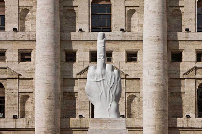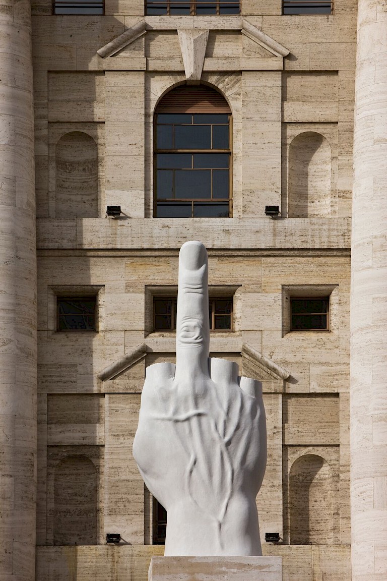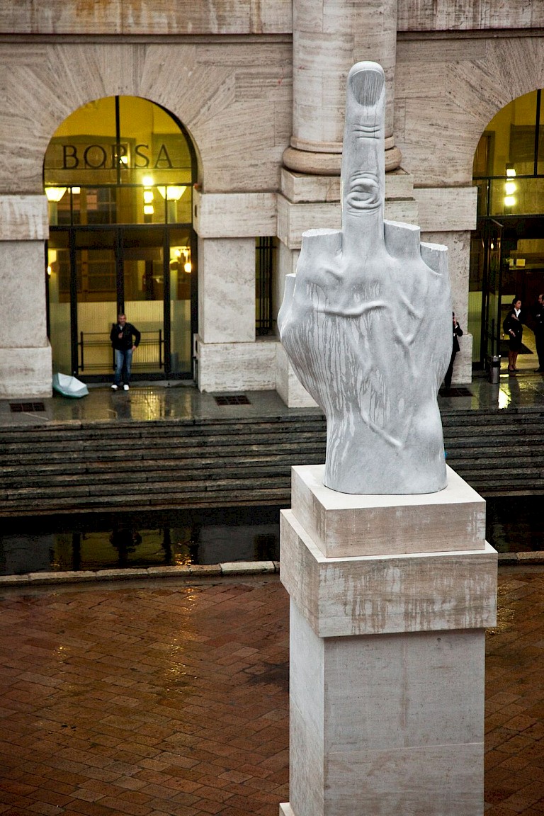 At the very centre of Piazza Affari, the square in Milan where the Italian stock exchange has its headquarters, is a marble statue depicting a hand with its middle finger extended. If you look closely, you’ll see that the other fingers are not flexed, butappear to be cut off; mimicing historical sculptures that are eroded over time.