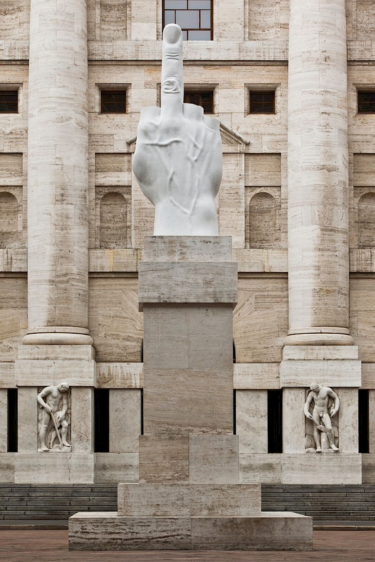 “L.O.V.E.” by Maurizio Cattelan placed in Piazza Affari in Milan. The 36-foot marble sculpture is placed outside the stock exchange in Italy’s financial capital. The giant marble middle finger is a controversial symbol greeting Piazza Affari and its grandest building, the 1932 Palazzo Mezzanotte, the stock exchange headquarters, which is a hallmark of Fascist architecture.
