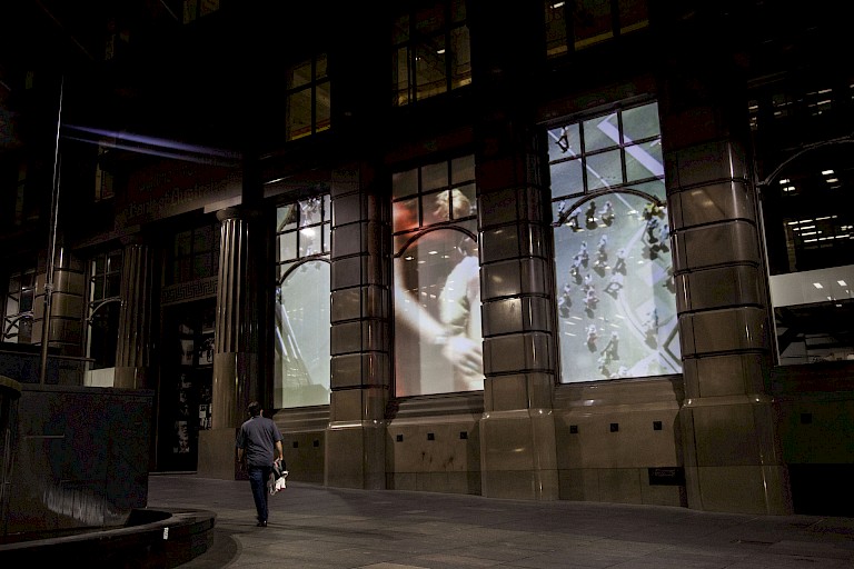 There can be no doubt that large-scale installations such as this temporarily transform the experience of a public space. The question of how precisely it transforms the public space is rather more complicated to answer. After all, large-scale advertising campaigns also transform the experience of public space. Does Last Drinks create a sense of nostalgia, as the title implies? If it does generate a longing for the ‘good old days,’ what exactly was good about those days? Were the wide class divisions of those days, or the treatment of Aboriginal communities at the time good, for example? Does Last Drinks encourage emotional investment in the site? Perhaps it does, by celebrating Australian icons such as broadcaster Peter Luck in the projections, or by reminding audiences of Sydney’s long history as an international city, and thereby contributing to civic pride. Rigorous frameworks for the evaluation of public art projects remain to be developed and implemented. For now, a great deal of evaluation must rest on available information and careful conjecture.