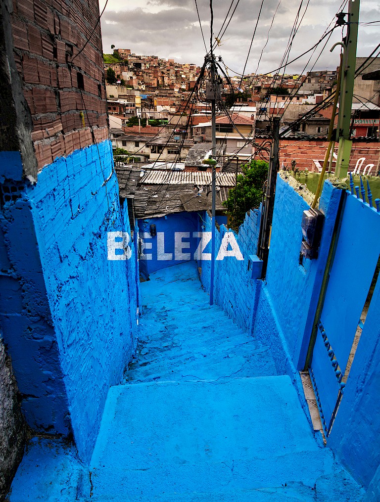The aesthetic of the project hints at the work required in such a chase. By avoiding traditional representational murals in favor of cleverly situated words floating in color, the collective forces new meaning from the crooked streets of the favelas. Instead of cramped, dangerous, confusing, or unsanitary, the streets reveal ingenuity and surprise. The first step in achieving strength, the project implies, is to simply adopt the right perspective.