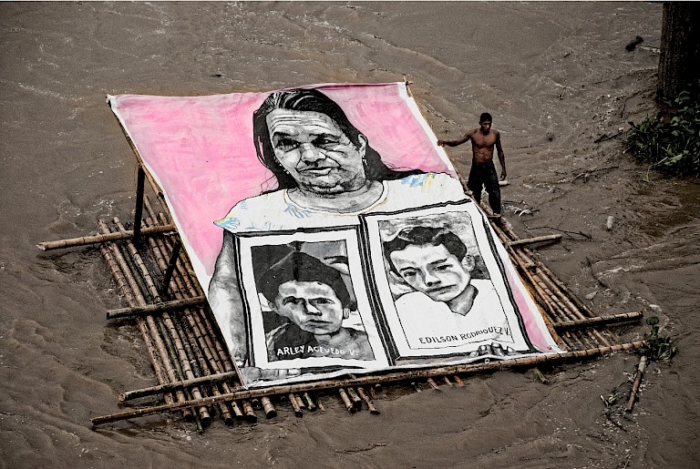 The project made the artists coexisting for three months with nearly 200 inhabitants of the Guayabito village in Cartago, north of Valle, and pass throughout the rivers populations of La Carbonera, from Caimalito, Pereira and Beltrán. However, the artists called the local community, to build rafts for release in the creek La Nona, which flows into the river Cauca, lit with candles, decorated with large drawings, gifts and flowers representing women holding portraits with the faces of disappeared people from Cauca and historical records of recovered bodies from the river.
