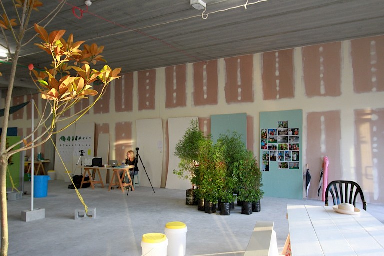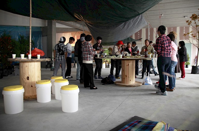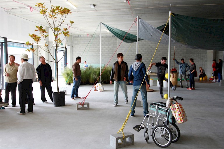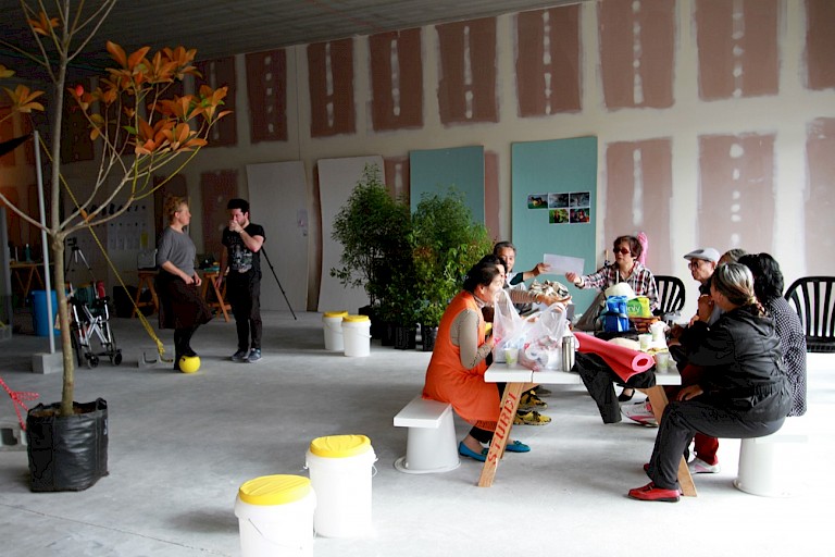 Tāmaki Makaurau Auckland (Aotearoa New Zealand), like Pōneke Wellington and Ōtautahi Christchurch, exhibits a low-density urban settlement pattern. Planning for Aotearoa’s three largest cities began with the grid, with “ample provision for public space like squares and parks.” However, these public spaces were “sacrificed to commercial imperatives” as the early townships developed, with the consequence that Auckland and Wellington “lacked organised public space to foster civic life” (Schrader, 2014). Meanwhile, residential dwellings privileged the “stand-alone house on an individual section and a cultivated garden” (Schrader, 2014), the fenced-in backyard and “bach” (holiday home) accommodating, to a degree, the social life that might elsewhere and otherwise occur in the public realm.Planners in the late 20th and 21st centuries attempted to address the deficit of civic or public life in these cities by providing civic squares and so-called “pocket parks.” Still, providing such facilities does not necessarily mean that prevailing patterns of public life are transformed overnight. It is in this historical context of urban development that the public artwork Park for a Day and the larger project Make Believe, to which it belongs, acquire their significance. Initiated by Kathy Waghorn (of the collective HOOPLA), Make Believe: Imagining a New Park for New Lynn began in 2012 when the artist/architect learned of plans by Auckland Council to establish a new ‘urban park’ in her neighbourhood (New Lynn, West Auckland). In discussions with the Council, it transpired that a park design had already been commissioned, but the result failed to meet the expectations of the Council’s Community Development Arts and Culture (CDAC) team. Make Believe arose out of a proposal by Waghorn to CDAC.“My proposal was that we generate a series of live, public-realm events on the park site that would make it visible, make it known by residents as a space of potential through producing transformative experiences of it and in it, and, in a transient and culturally diverse neighbourhood, create personal and collective experiences of the place, connecting the past with the future.” (Waghorn, 2017, p. 42)Four projects took place as part of Make Believe between 2012-2014, each generating playful and participatory modes of public engagement in the imagination and design of an urban park in the neighbourhood. Park for a Day was one of these projects, resulting from an invitation to the Suburban Floral Association (a collaboration between artists Monique Redmond and Tanya Eccleston) to develop a work. Waghorn became aware of the Chinese Eco Elders, an already-established neighbourhood group comprising elderly new migrants from China. This group had appropriated a rubble-filled space at the end of a car park left over from nearby development in New Lynn, close to the site for a planned new urban park and transformed this into their own small community garden.Acknowledging their existing interest in botanical spaces and informed by a series of translated conversations, in Park for a Day, SFA worked with the Chinese Eco Elders to develop a day-long installation, a “temporary landscape” inside a vacant shopping development in New Lynn on the 3rd of May, 2014.“Fabricated from stretched tarpaulins, rope, huge cable reels, concrete blocks, timber planks, many potted plants, pieces of furniture and large-scale photographic prints, this Park for a Day responded to a series of conversations with the Elders. The ‘park’ installation was an abstraction, a ‘not-to-scale’ test of possibility where provisional materials were used to make spaces and shelters in which to eat, move, exercise, relax, gather and converse.” (Waghorn, 2017, p. 62).Hosted by SFA and Waghorn and attended by the Chinese Eco Elders and their extended families and friends, interpreters, CDAC staff and volunteers, the event within the installation took the form of convivial conversations around the cooking and sharing of food. SFA describes the makeshift “landscape” created within the vacant building as a “propositional space”, but the project might also be characterised as a form of social sculpture. Instead of ‘consulting’ via pre-formed, language-based methods, CDAC staff were able to join the Chinese Eco Elders in this carefully crafted temporal ‘park’ and together imagine and perform possibilities for the future urban park.