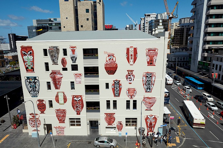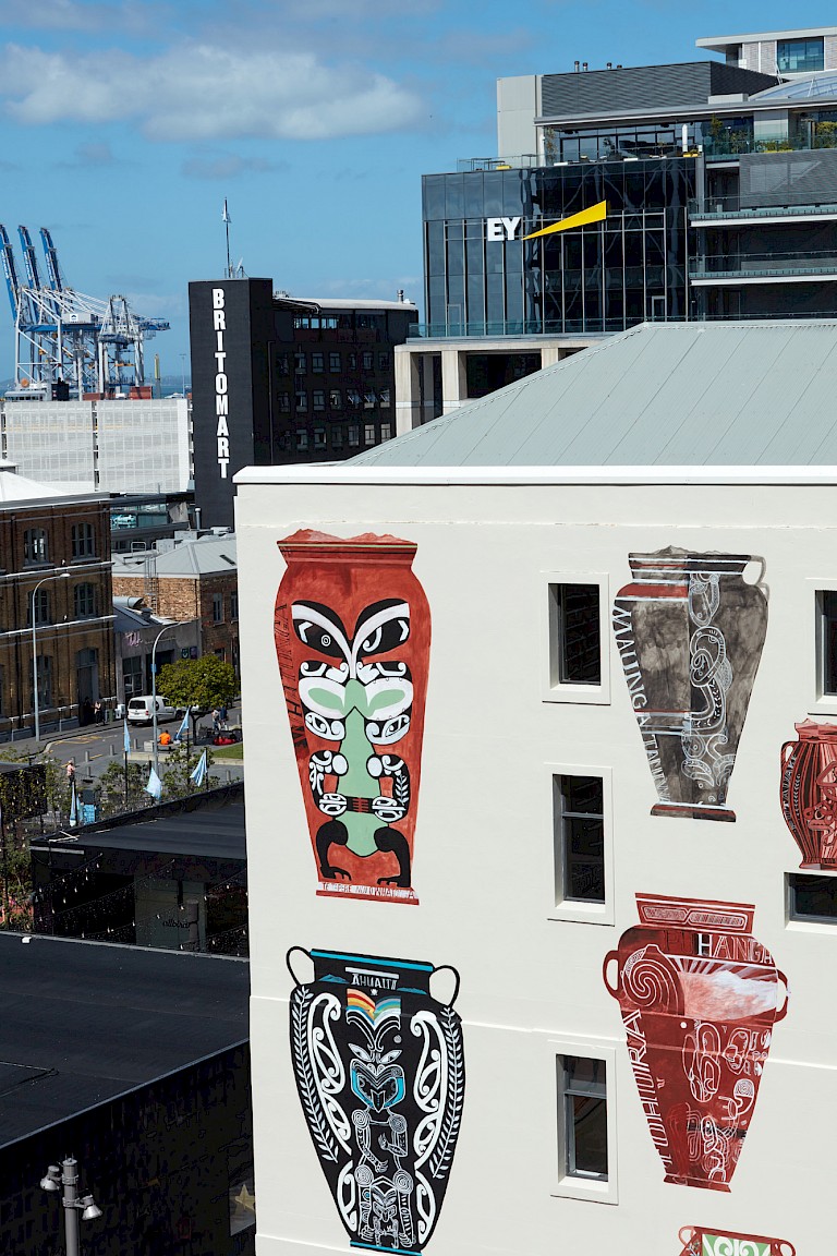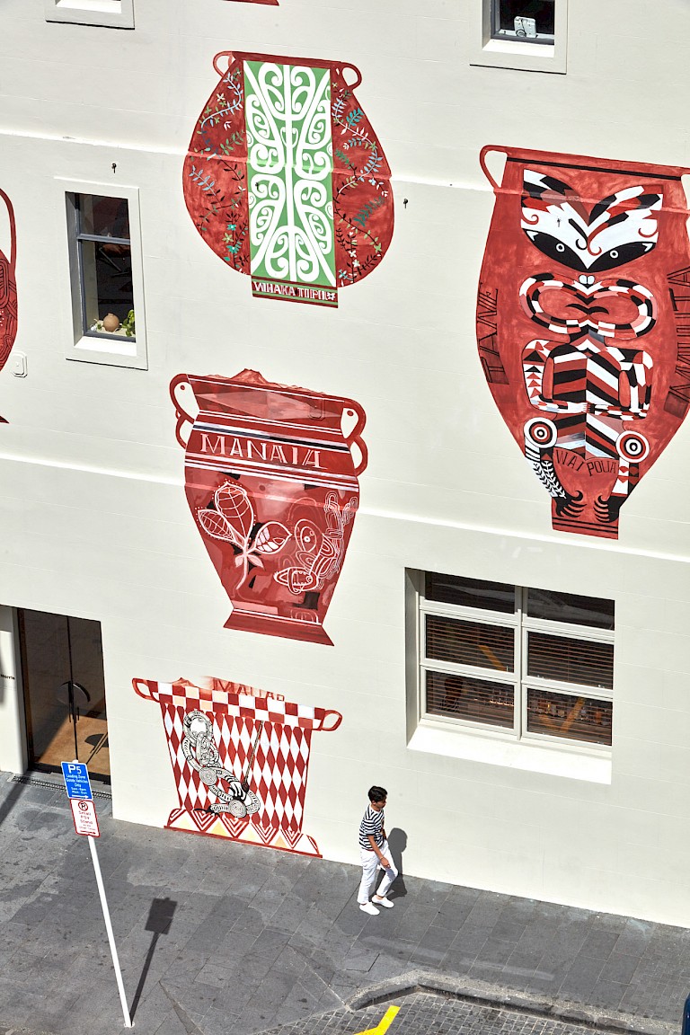 It is impossible to view Cotton’s work in isolation, rather it is the latest in a series of works by Māori artists in the city that follow the paths of the old streams and rivers, now underground waterways of Tāmaki Makaurau (Auckland). So it is fitting that of the two commissions that Cotton produced in conjunction with Toi Tū Toi Ora, the work in the Auckland Art Gallery is a skiff, not unlike one would see launched from a visiting British ship, and the painting on the outside wall of Excelsior House is a series of vessels. The selection of the building and its location approximate to the city’s waterfront, across the street from the ferry terminal and the old Customhouse reinforce these watery associations.