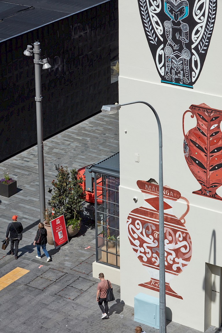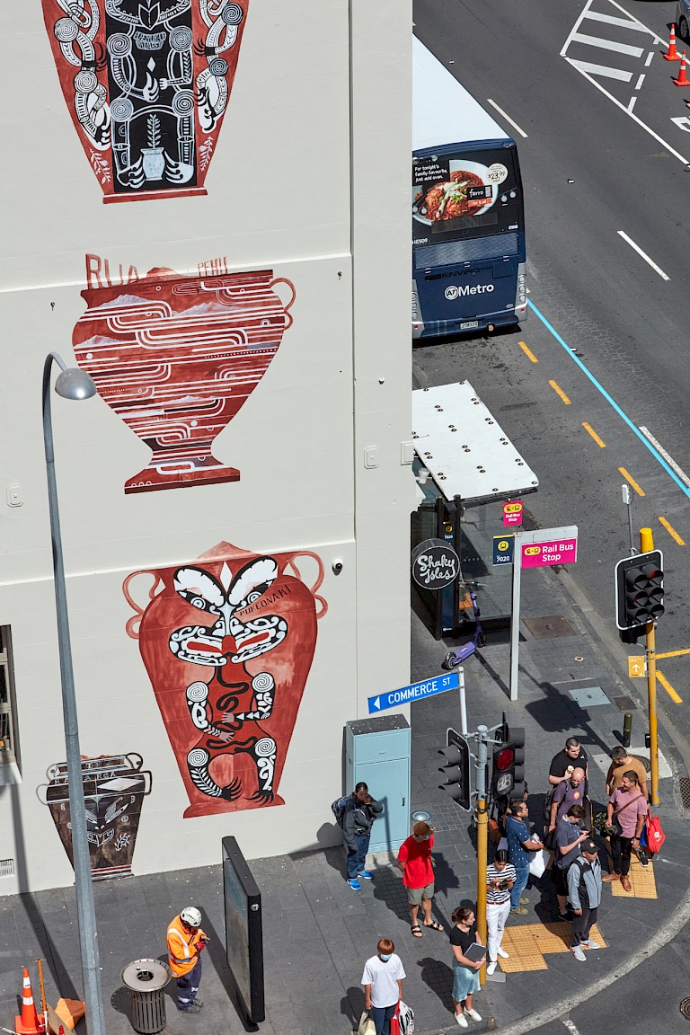 The basis of the Maunga is a series of 25 works on paper created by Shane Cotton in response to Britomart’s commission. He and artist Ross Liew collaborated on the translation of those works into the five-storey-high artwork that now occupies the corner of Customs Street East and Commerce Street.