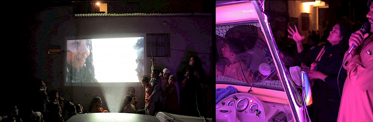 Upon her return from studying in the US, Chaudhri was particularly concerned with the increasing privatization and class segregation in Karachi. To break this seegregation, which can also be found in art galleries - spaces that cater to elite classes, and architectures that divide Karachi by class, ethnicity and gender. To counter this, Chaudhri and her team - the 'Tentative Collective' - created a program that would depend wholly on local interest and interactions. The project was variously funded through crowdfunding, and through the 'Artspire' program of the New York Foundation for the Arts, and additionally funded by the United States Institute of Peace, National University Singapore, and materially supported by local outfits and individuals such as Sazgar Rickshaws, Raja Sabri and Shafayat Bhai who constructed the MKMC rickshaw projection unit.
