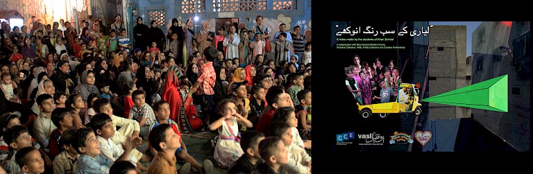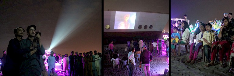 Mera Karachi Mobile Cinema (MKMC) is a series of film projections across the city of Karachi, Pakistan, working with ethnically and economically diverse residential colonies across Karachi. The project involves collected mobile camera videos and shorts about everyday Karachi life made by the residents of the colonies involved, and projecting them in public spaces within those colonies with the help of the MKMC rickshaw – a jazzed up version of the ubiquitous rickshaw – which is fitted with a projector, and drives around the city to set up MKMC at various places. Karachi, the capital of the Sindh Province, is one of the largest cities in Pakistan – especially in numbers. Being a port city, it is also home to various communities that have settled here over time. Over the last few decades Karachi’s reputation as a dangerous city with high crime rates led to the building of numerous walls all over the city – especially around public spaces. The various forms of walls aimed to privatise a space, keeping out “unwanted” elements, leading to segregation and separation in the various communities that lived in Karachi. In response to this, Yaminay Nasir Chaudhri, an architecture graduate from Cornell University came up with the idea of ‘Mera Karachi Mera Cinema’. The aim was to introduce pop-up open air cinemas as a way to re-connect the various separated people of Karachi. Chaudhri set up ‘tentative collectives’ (where the Tentative Collective gets its name from), to work within various colonies – and each collective helped the diverse range of people they worked with to create the amateur films that would eventually be screened by MKMC. Additionally, the team chose to focus their sites outside the popular architecture of Karachi, going to forgotten, ignored localities.