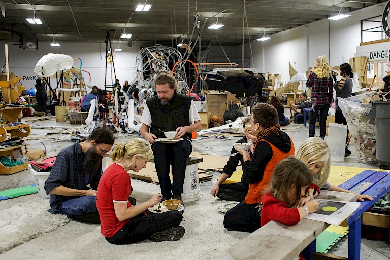 The work of BareBones thrives on collaboration, participation, sharing, and inventive material re-use. By allowing the production of their work to follow organic pathways, the troupe of professional and amateur creators celebrates every talent brought to the table by community members. With open community story-boarding events, puppet builds, t-shirt printing, and performance practices, no one is turned away. Participants range from toddlers to 70 year old artists and each plays an important role in the outcome of the event. Indeed, BareBones prides themselves on the collaborative aspect of their work, one so collective and vast that the sole ownership of any project becomes impossible.