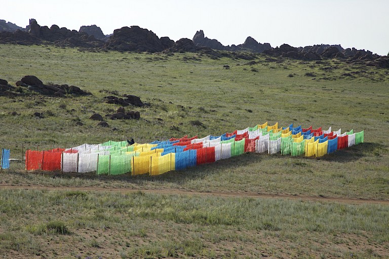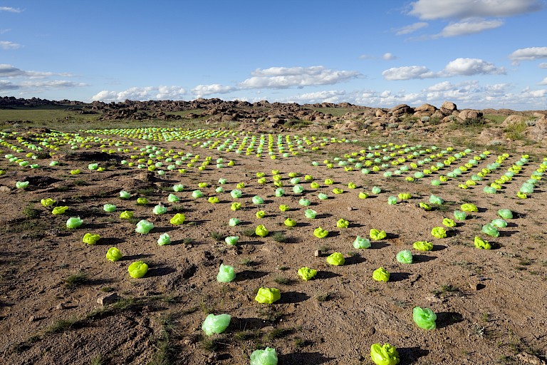 27 local and international artists in total participated in Mongolia 360, creating an extremely diverse range of work. For his contribution, Mongolian artist Chimeddorj Shagdarjav wrapped a 10-ton large rock in clear plastic packaging, replicating the details of Mongolian duty free shopping bags at larger-than-life scale. We might interpret this work as a provocation to audiences to consider the environmental impact of tourism and long-distance air travel on the fragile ecology of Mongolia. Maro Avrabou and Dimitri Xenakis’ works addressed water and arable land scarcity. Water consisted of 6 blue fabric circles (each of three meters in diameter) arranged systematically on a flat stretch of desert. Kitchen Garden consisted of 700 crumpled green rubbish bags set out in a geometric array to look like a domestic garden of lettuce heads. In both cases, a single color served to evoke the scarcity of a resource, the absence of pools of blue water and the impossibility of growing salad leaves respectively. Other works variously commented on the expansion of the Gobi desert, the effects of mining, and the relationship between human bodies and the earth.